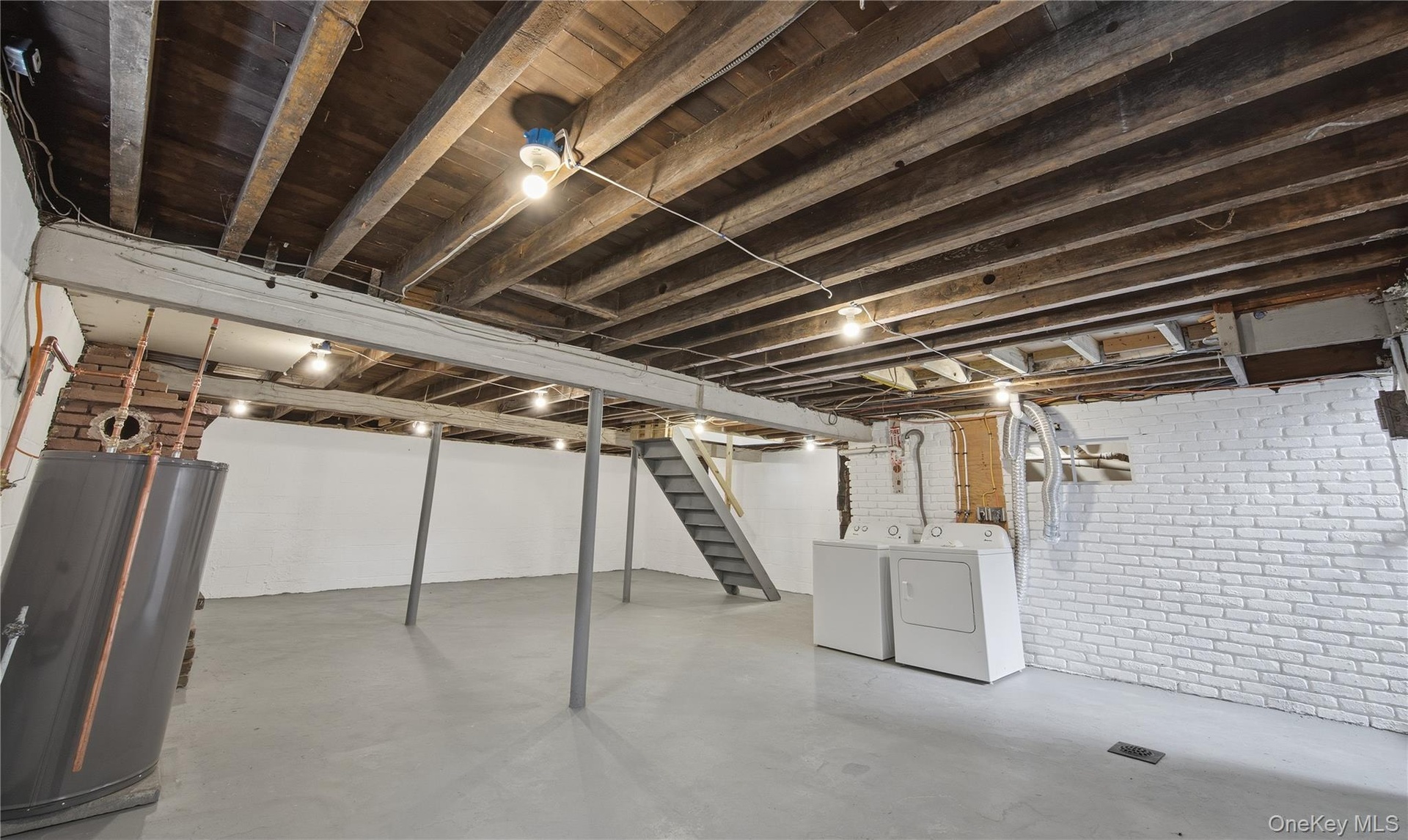 - Unfinished basement featuring water heater, stairs, and separate washer and dryer