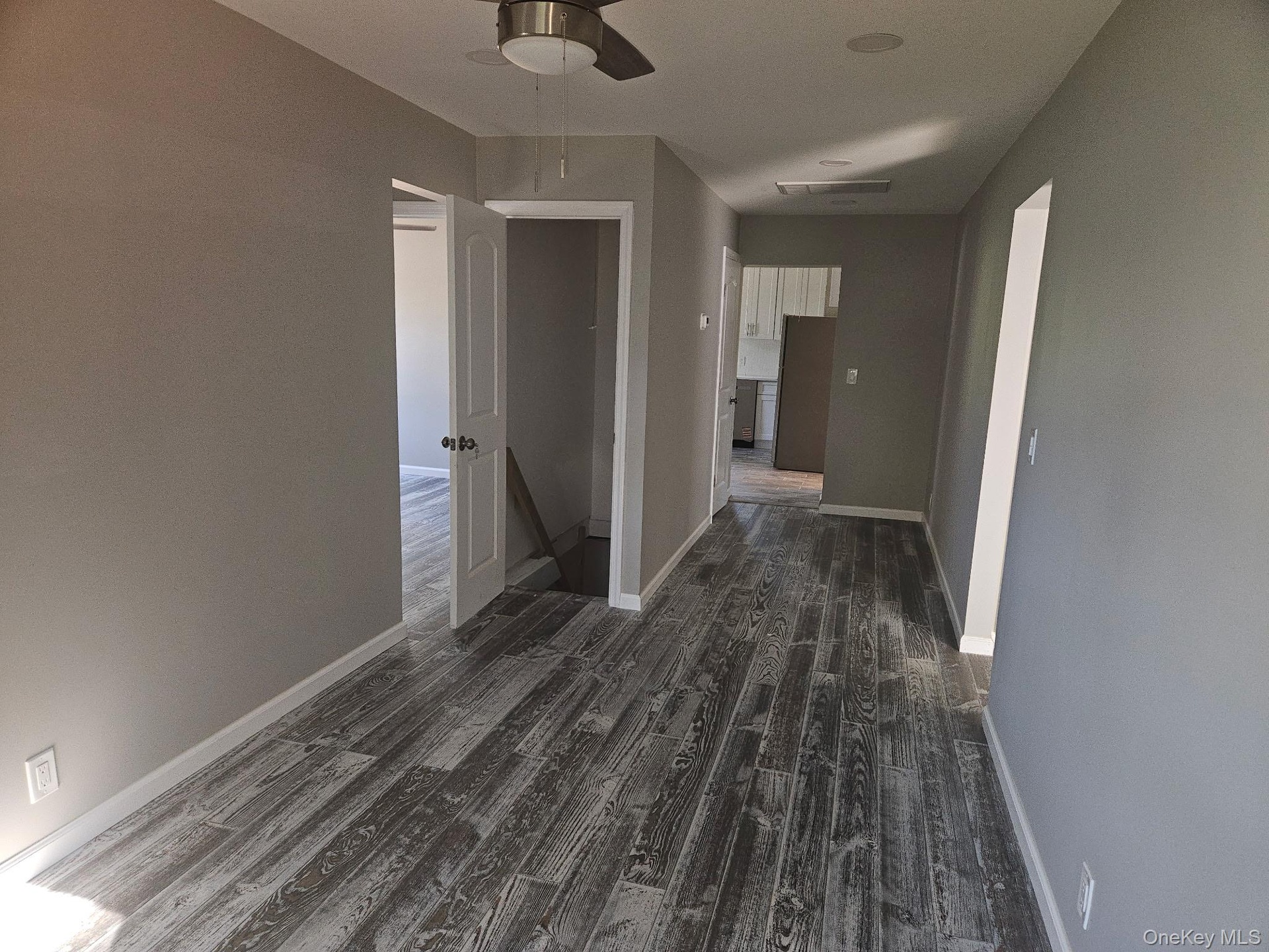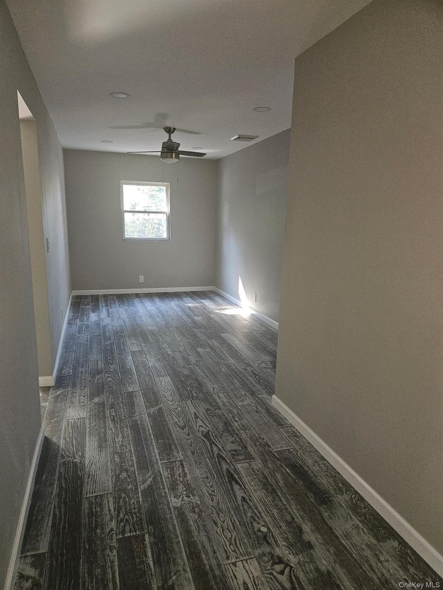- Spare room featuring dark wood-style flooring and ceiling fan