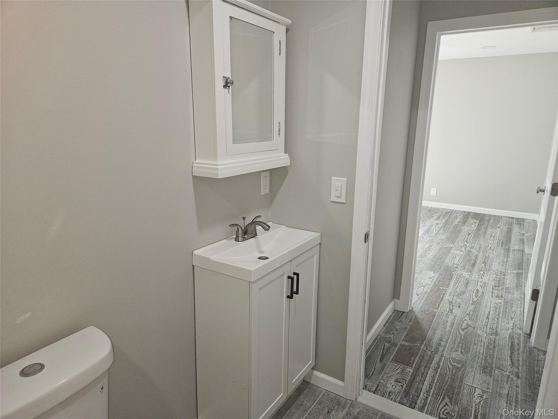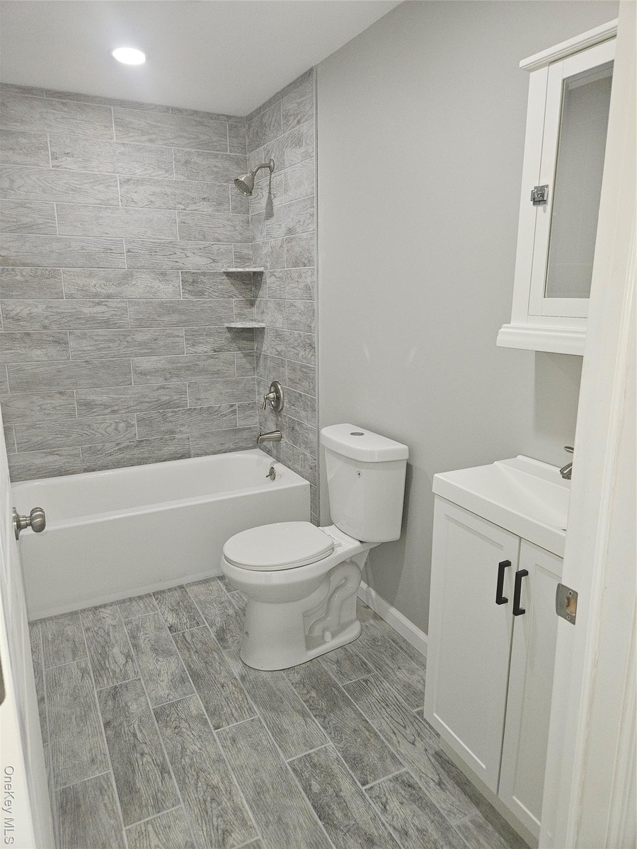 - Bathroom with bathtub / shower combination, vanity, and wood tiled floors