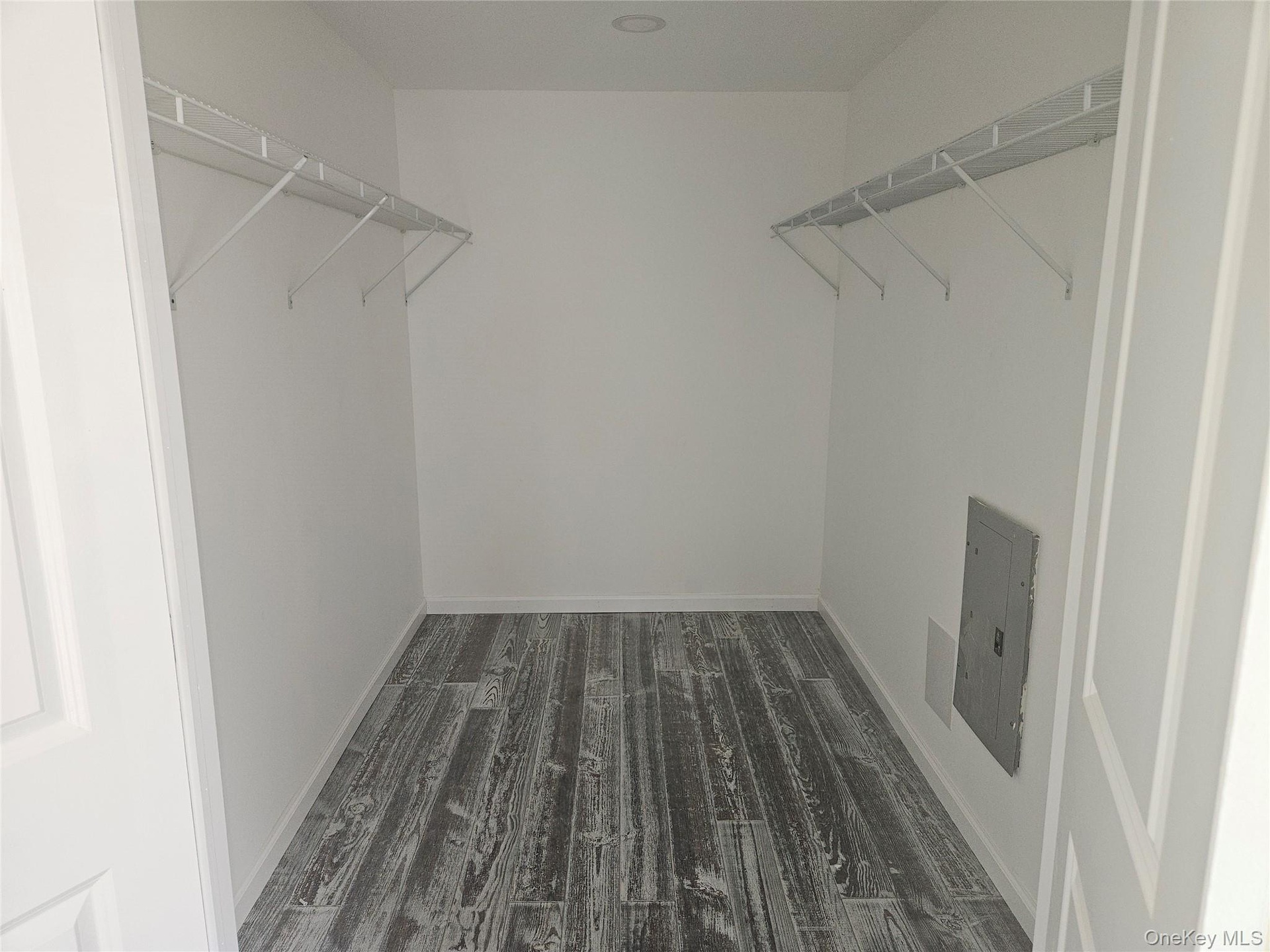 - Primary Bedroom walk in closet with dark wood-style flooring and electric panel