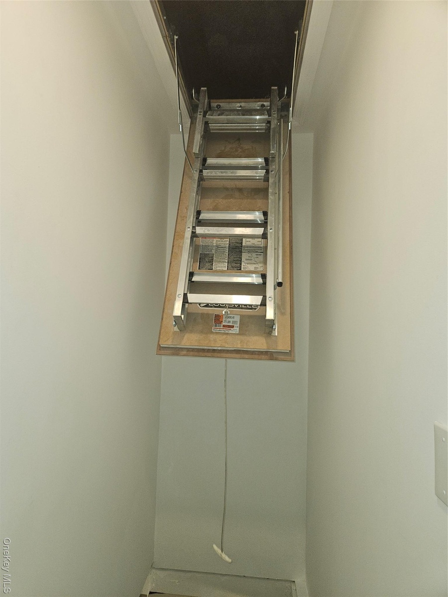 - Unfinished basement area featuring stairs and separate washer and dryer, water heater and fireplace.