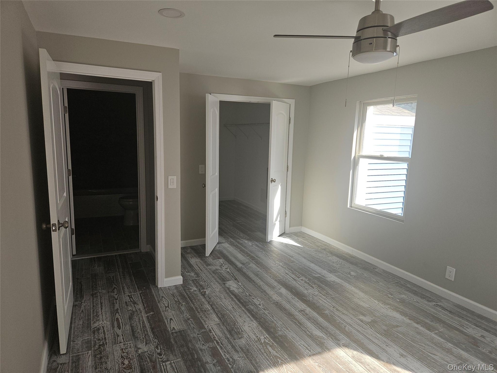 - Unfurnished bedroom with dark wood-style flooring, a spacious closet, and a ceiling fan