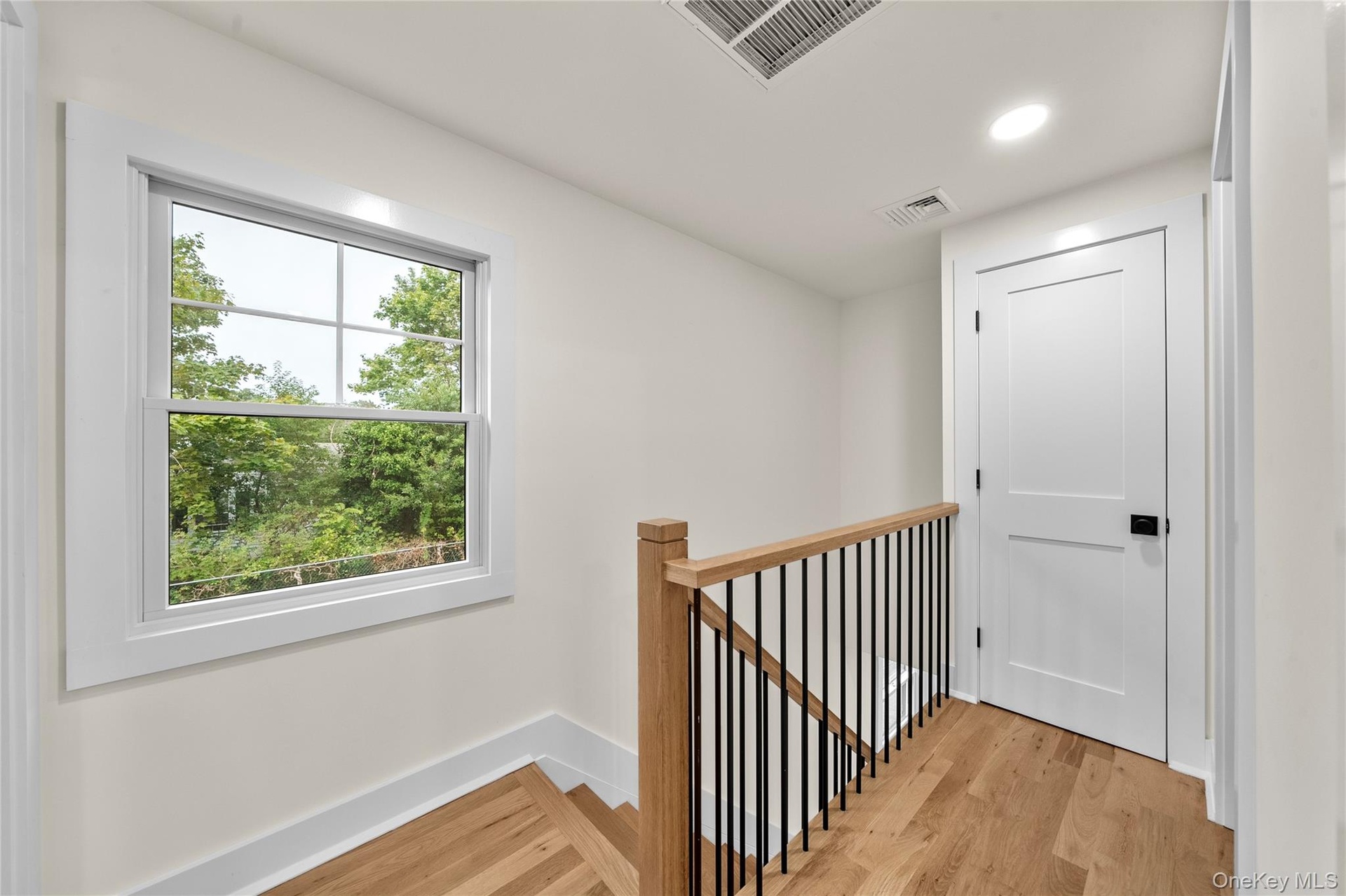 - Hallway featuring an upstairs landing, light wood-style flooring, and recessed lighting