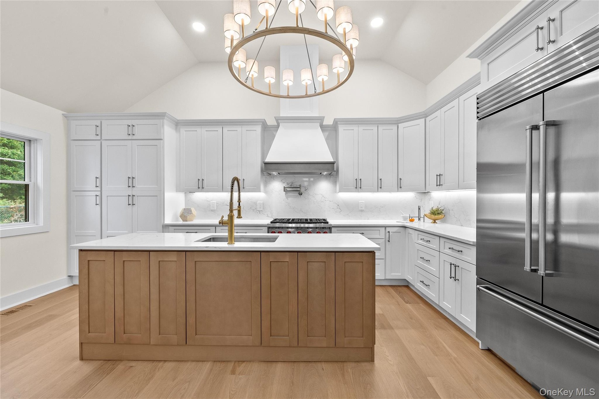 - Kitchen featuring stainless steel built in refrigerator, vaulted ceiling, tasteful backsplash, pendant lighting, and light wood-type flooring