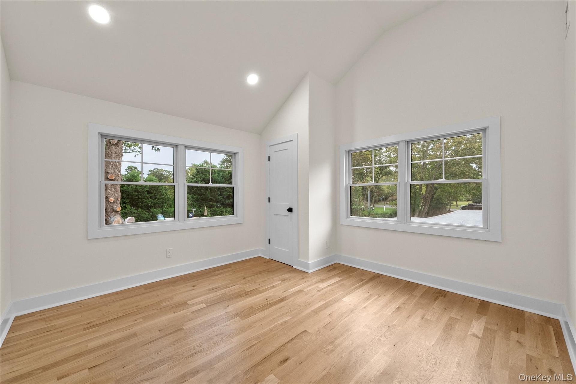 - Unfurnished bedroom with light wood-style floors, recessed lighting, and high vaulted ceiling