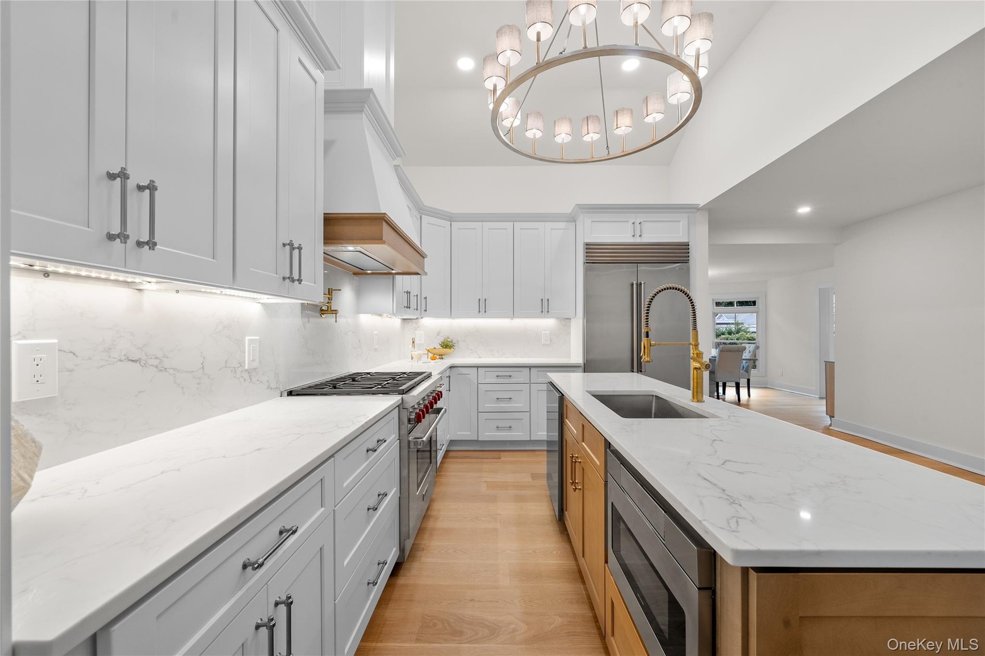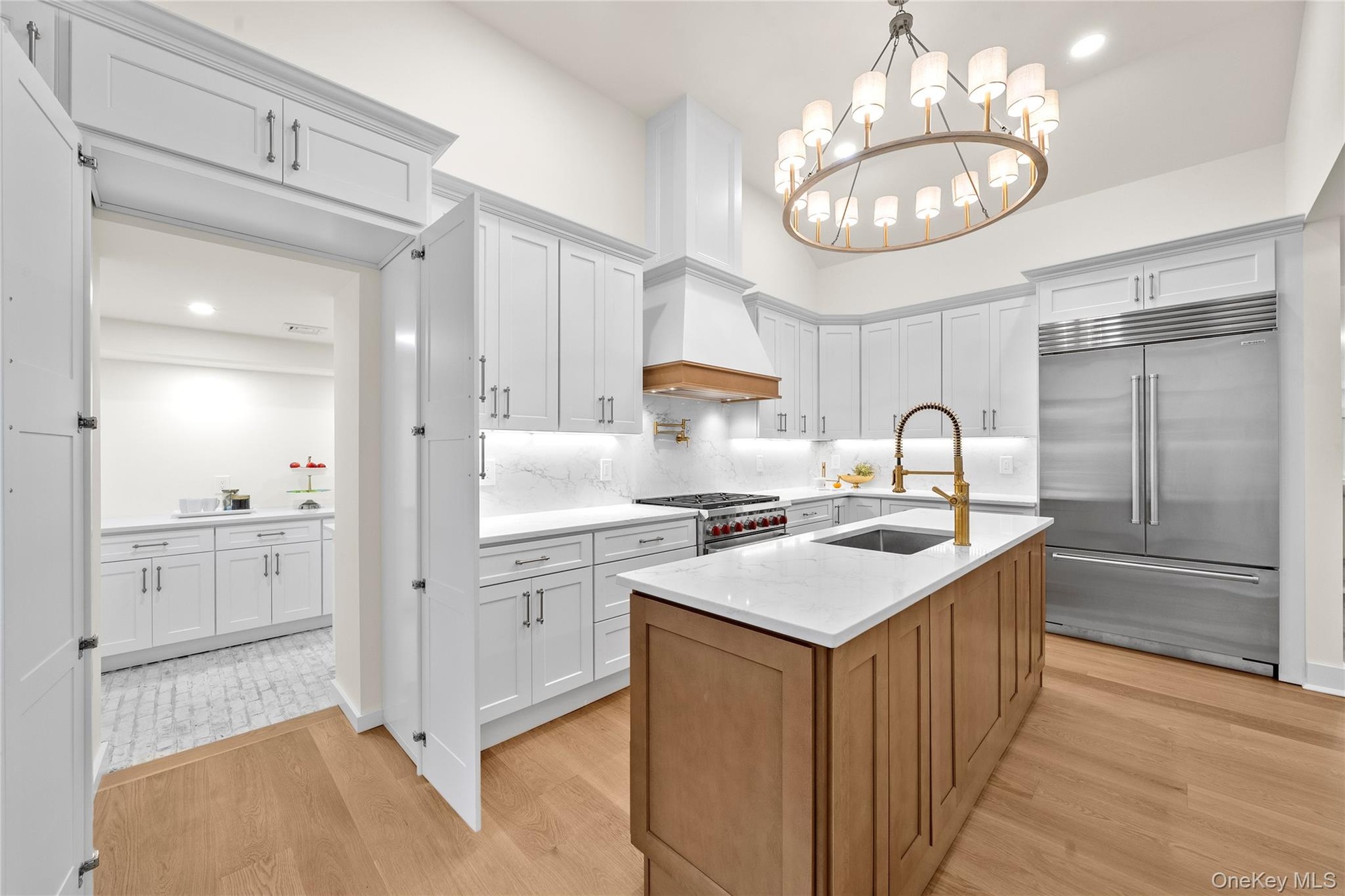 - Kitchen featuring decorative light fixtures, stainless steel built in refrigerator, light wood-type flooring, white cabinetry, and light stone counter