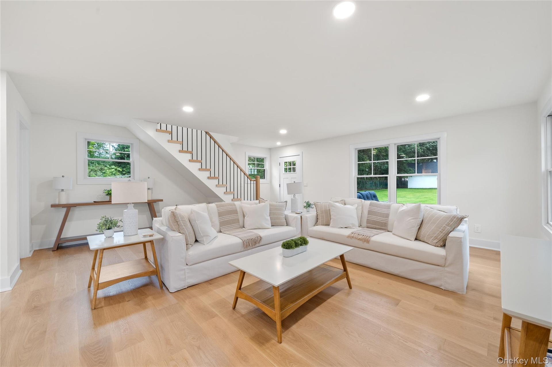 - Living room with light wood-style flooring, recessed lighting, and stairway