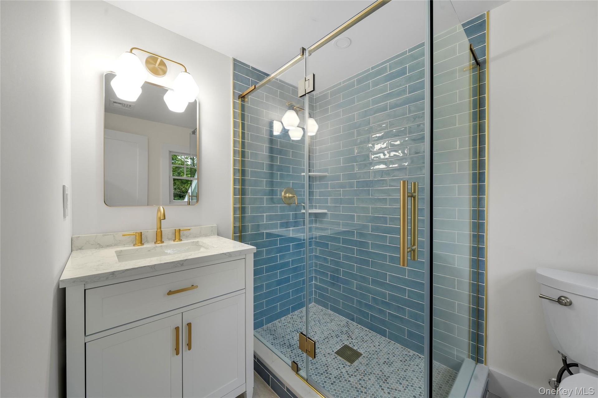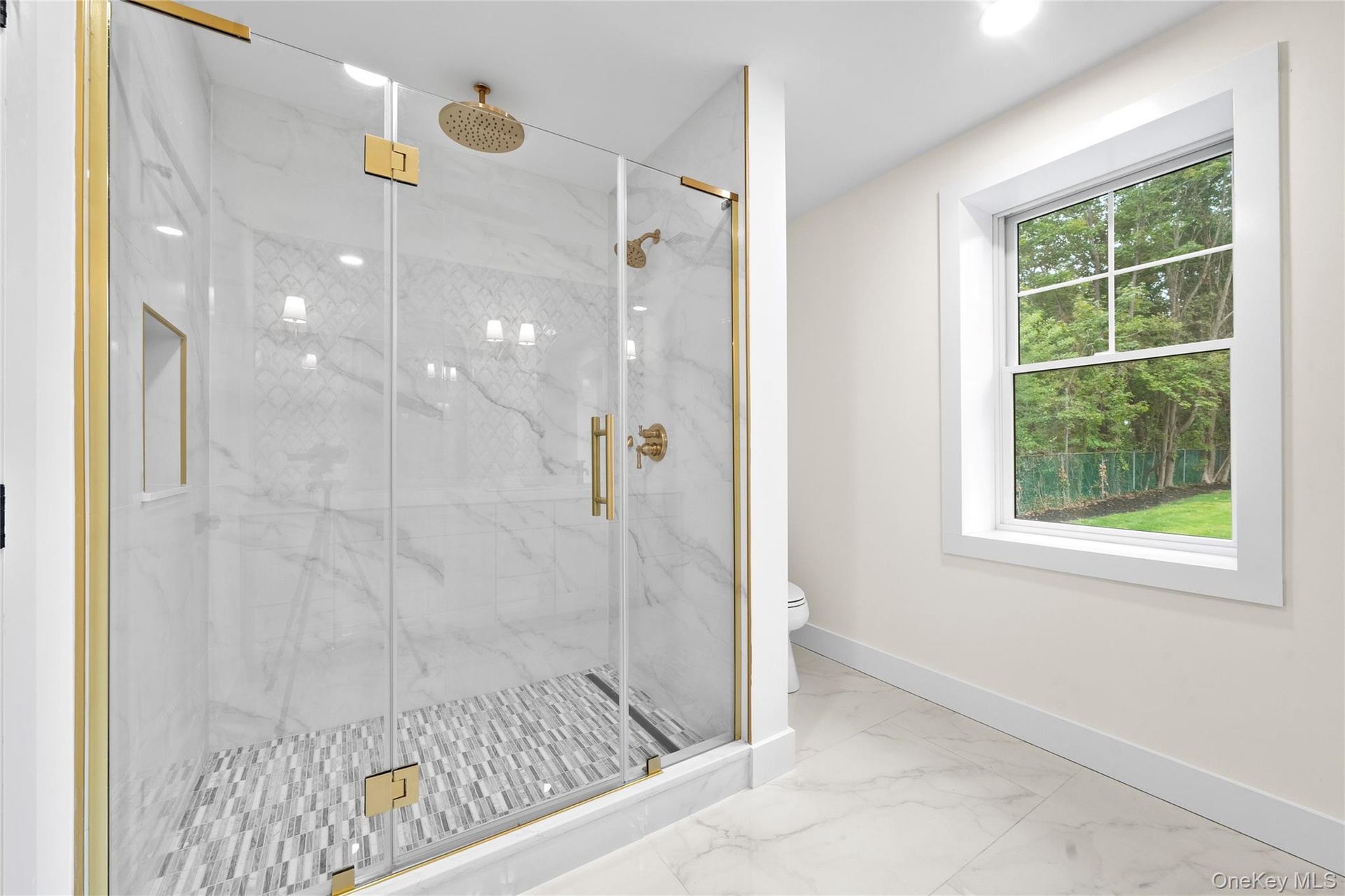 - Full bathroom featuring a marble finish shower and marble look tile flooring