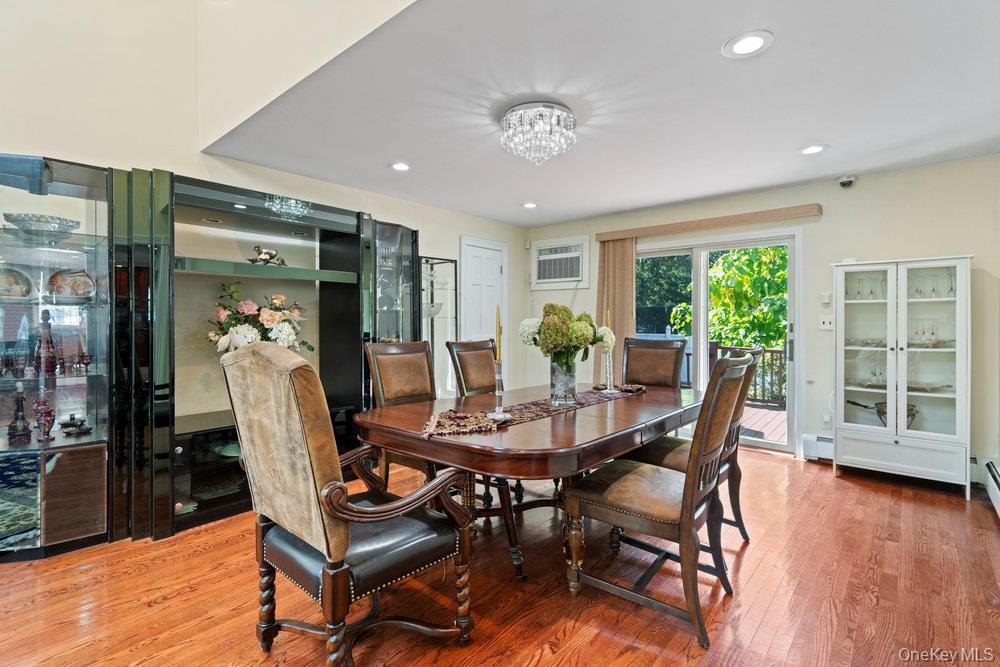 - Dining room with wood finished floors, recessed lighting, a baseboard radiator, a chandelier, and a wall unit AC