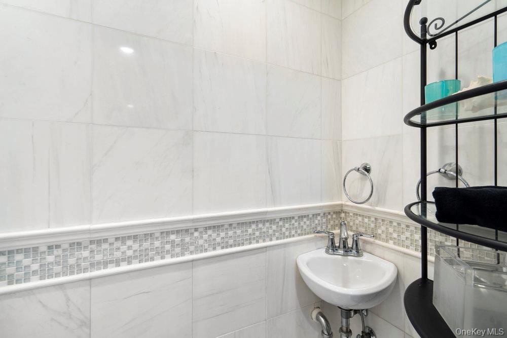 - Bathroom featuring tile walls, crown molding, and double vanity