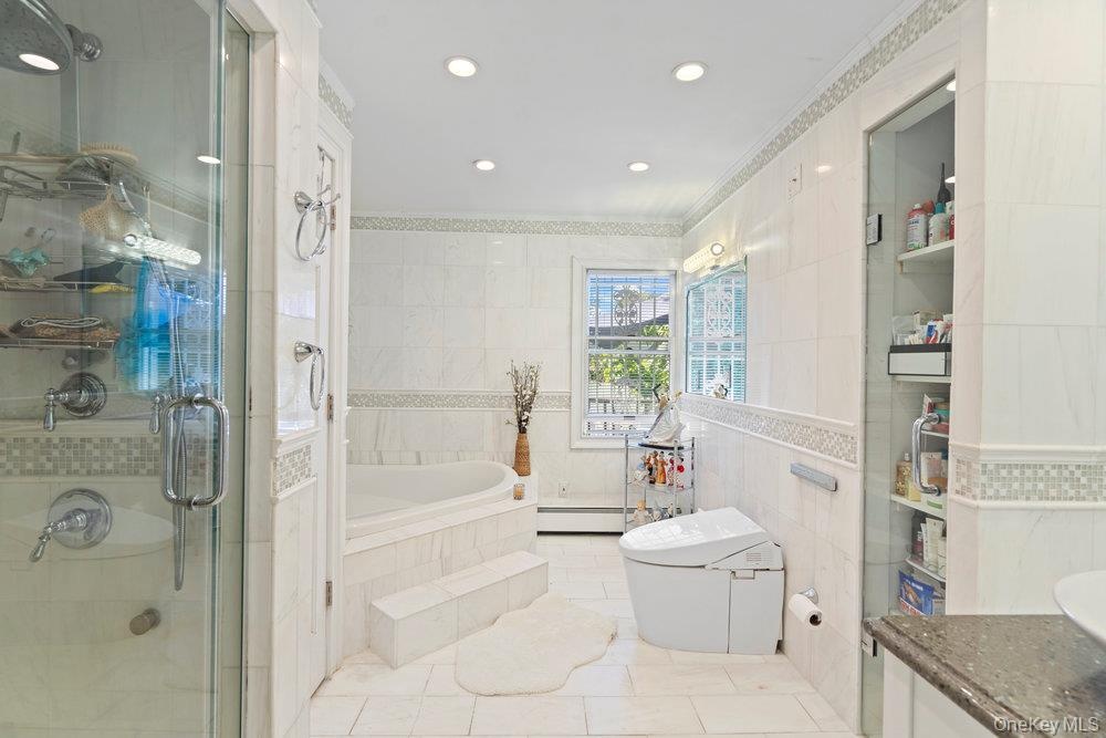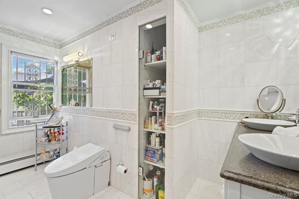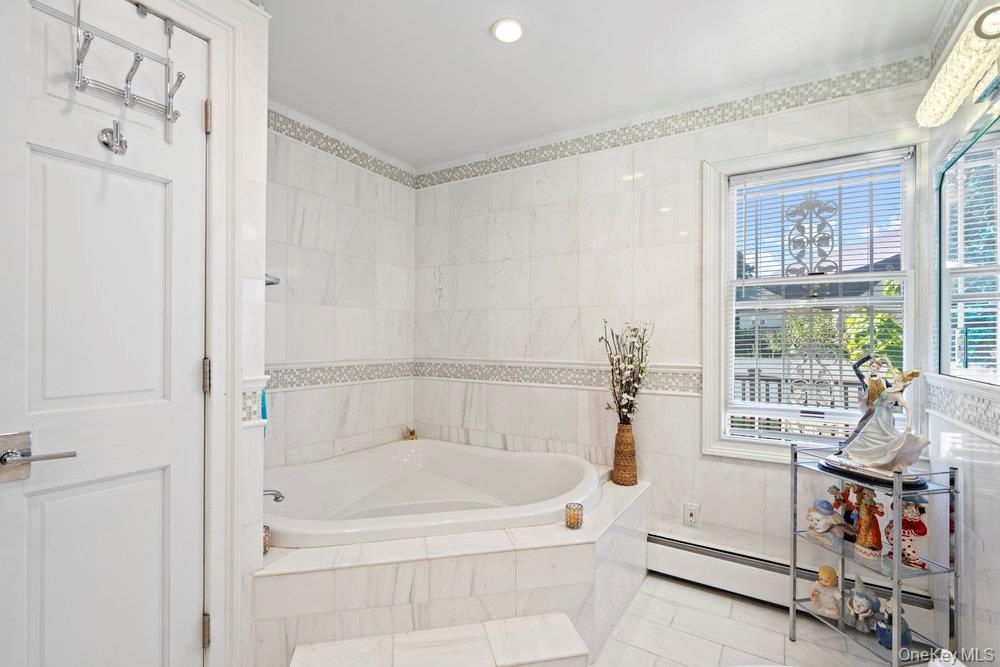 - Full bath with tile walls, a bath, a baseboard radiator, recessed lighting, and crown molding
