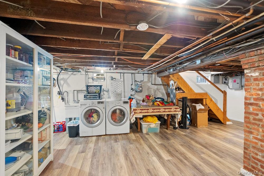 - Unfinished basement featuring wood finished floors, stairs, washing machine and clothes dryer, and electric panel