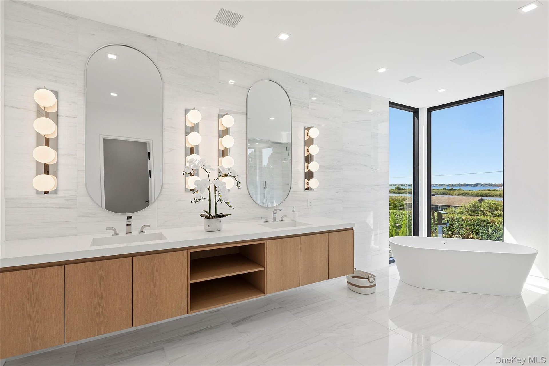 - Full bathroom featuring expansive windows, tile walls, a freestanding tub, double vanity, and light marble finish flooring