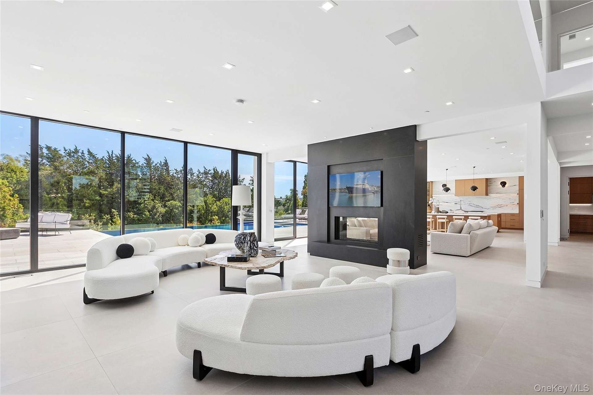 - Living area featuring expansive windows, recessed lighting, and a multi sided fireplace
