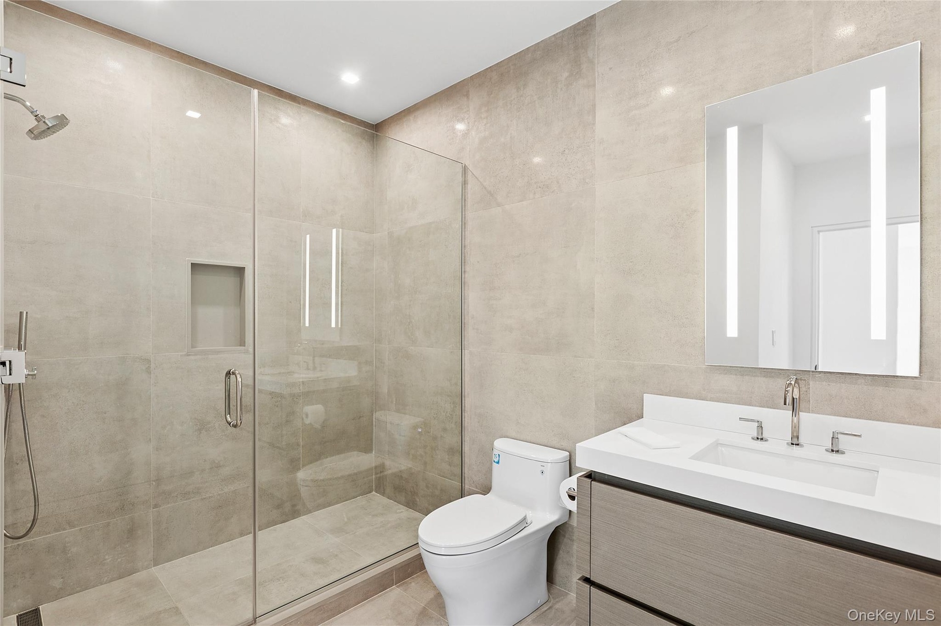 - Bathroom featuring tile walls, a shower stall, and vanity