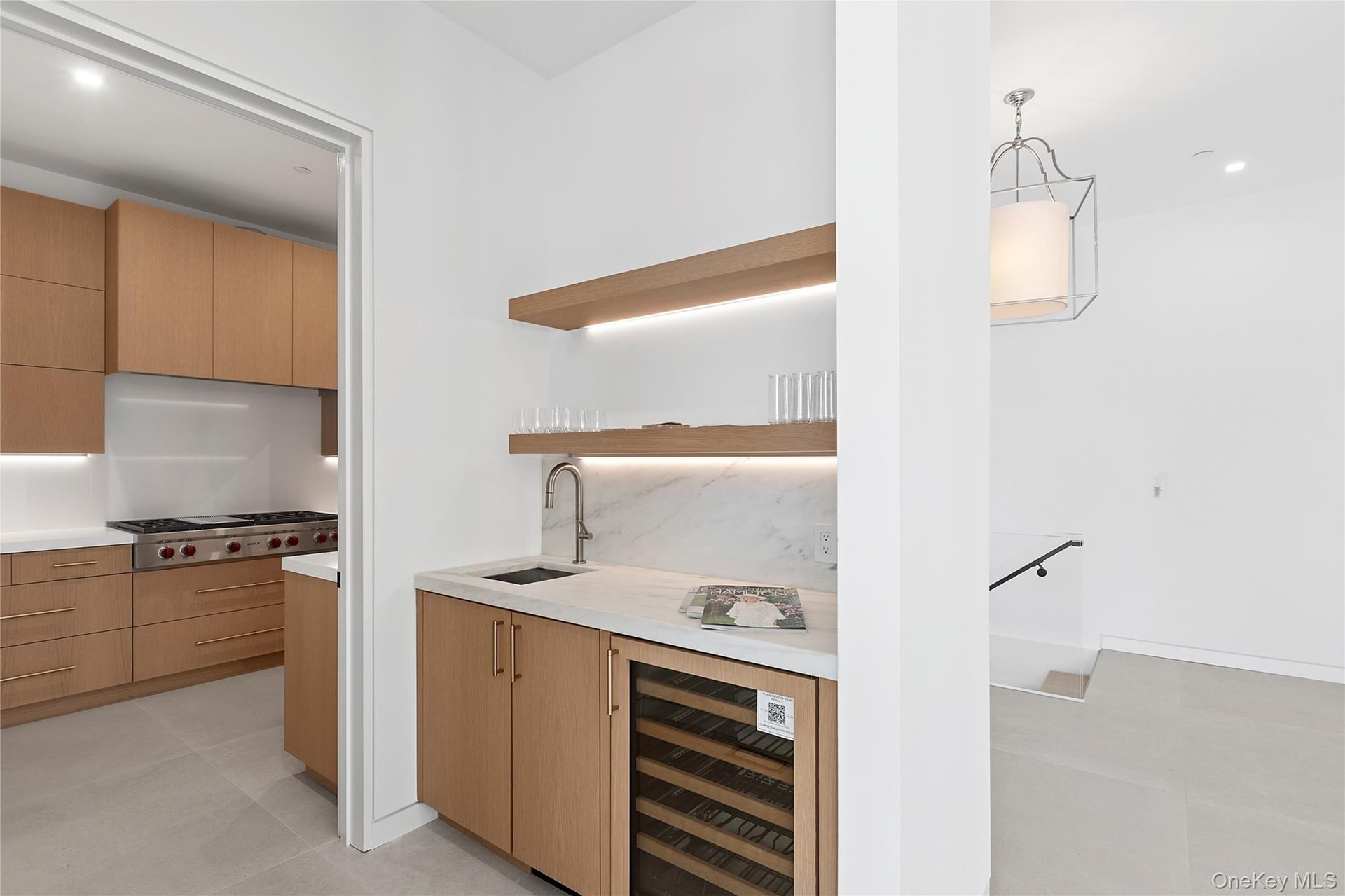 - Indoor wet bar featuring open shelves, wine cooler, modern cabinets, light brown cabinets, and recessed lighting