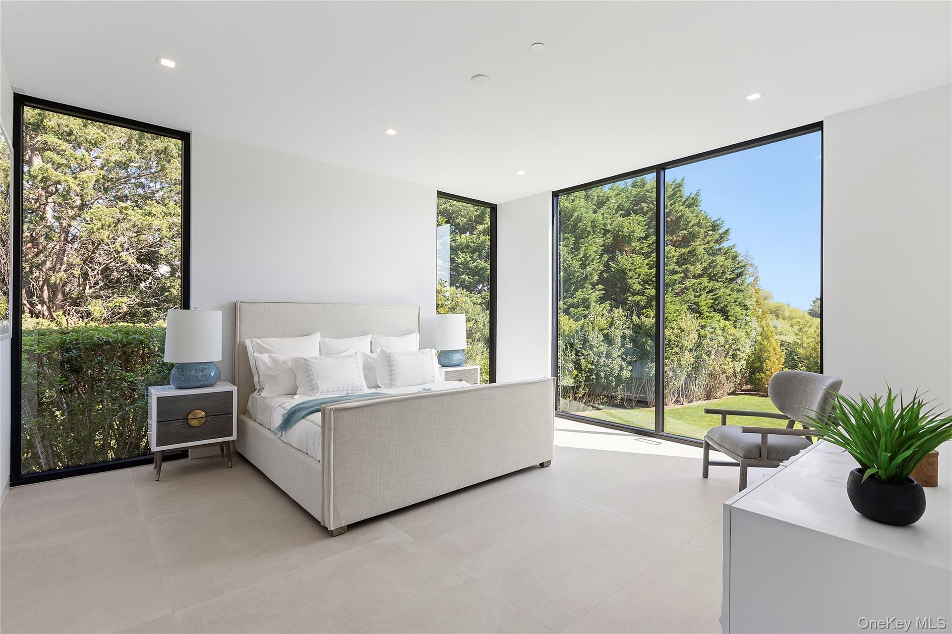 - Bedroom with a wall of windows, access to outside, and recessed lighting
