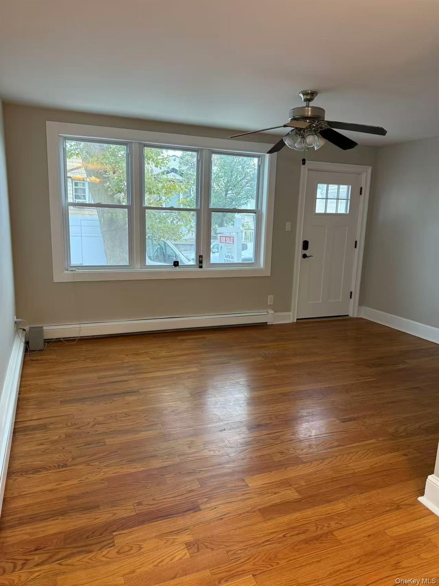 - Foyer with light wood-type flooring, a baseboard heating unit, and a ceiling fan