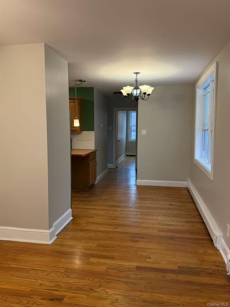 - Unfurnished dining area with baseboard heating, light wood-type flooring, healthy amount of natural light, and a chandelier