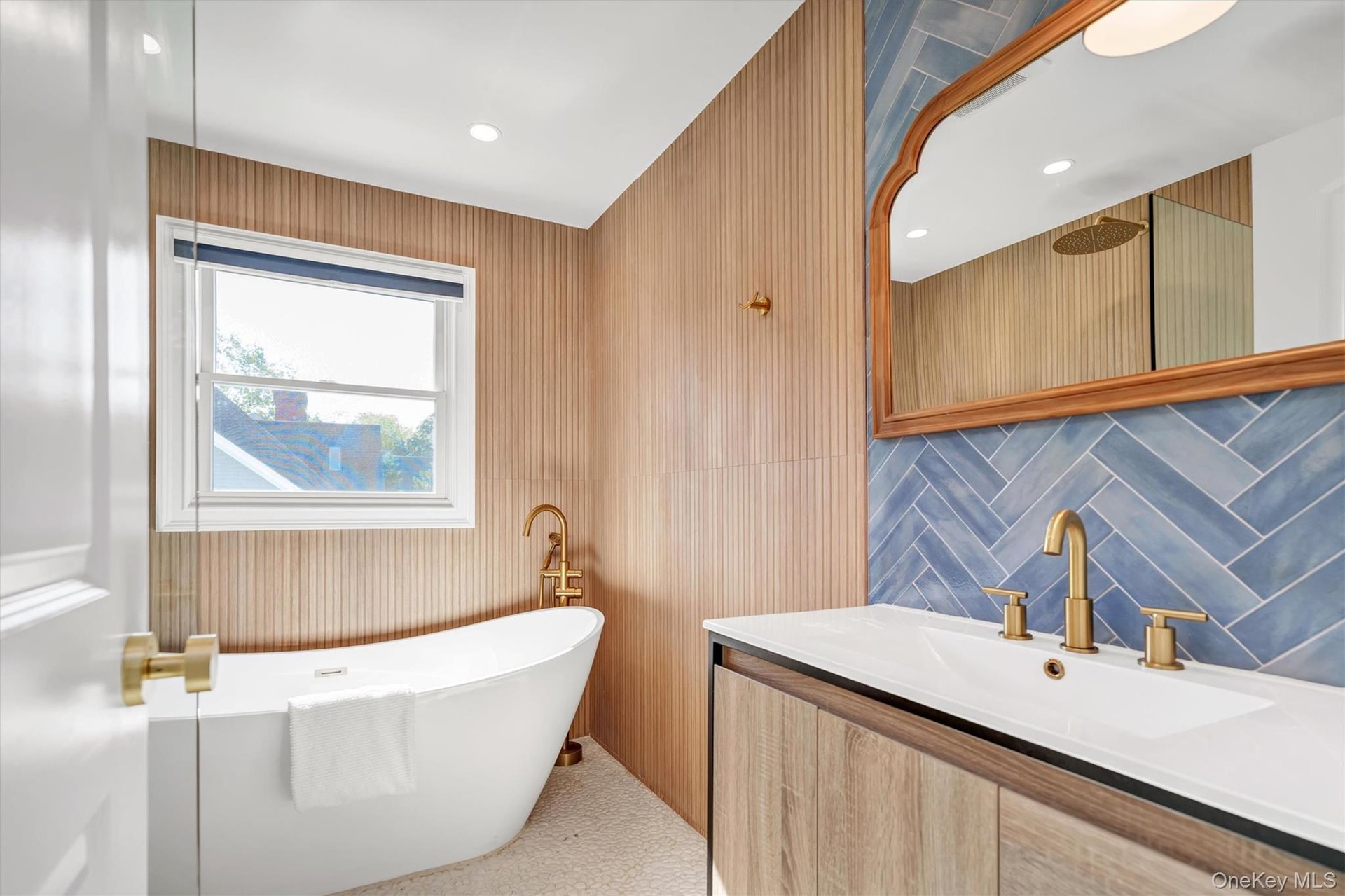 - Bathroom with a freestanding tub, vanity, backsplash, a shower, and recessed lighting
