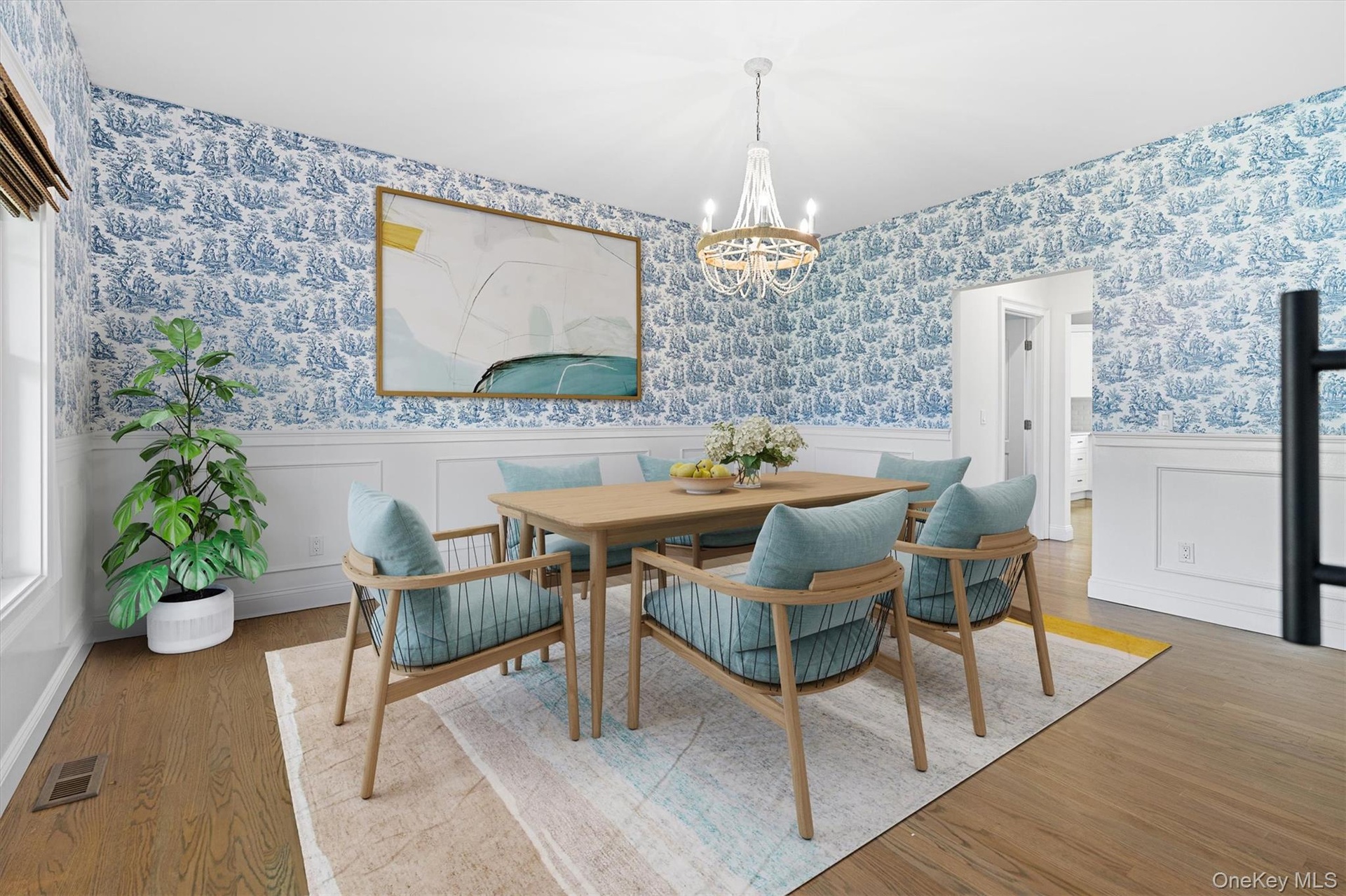 - Dining area with wallpapered walls, wainscoting, a chandelier, and wood finished floors