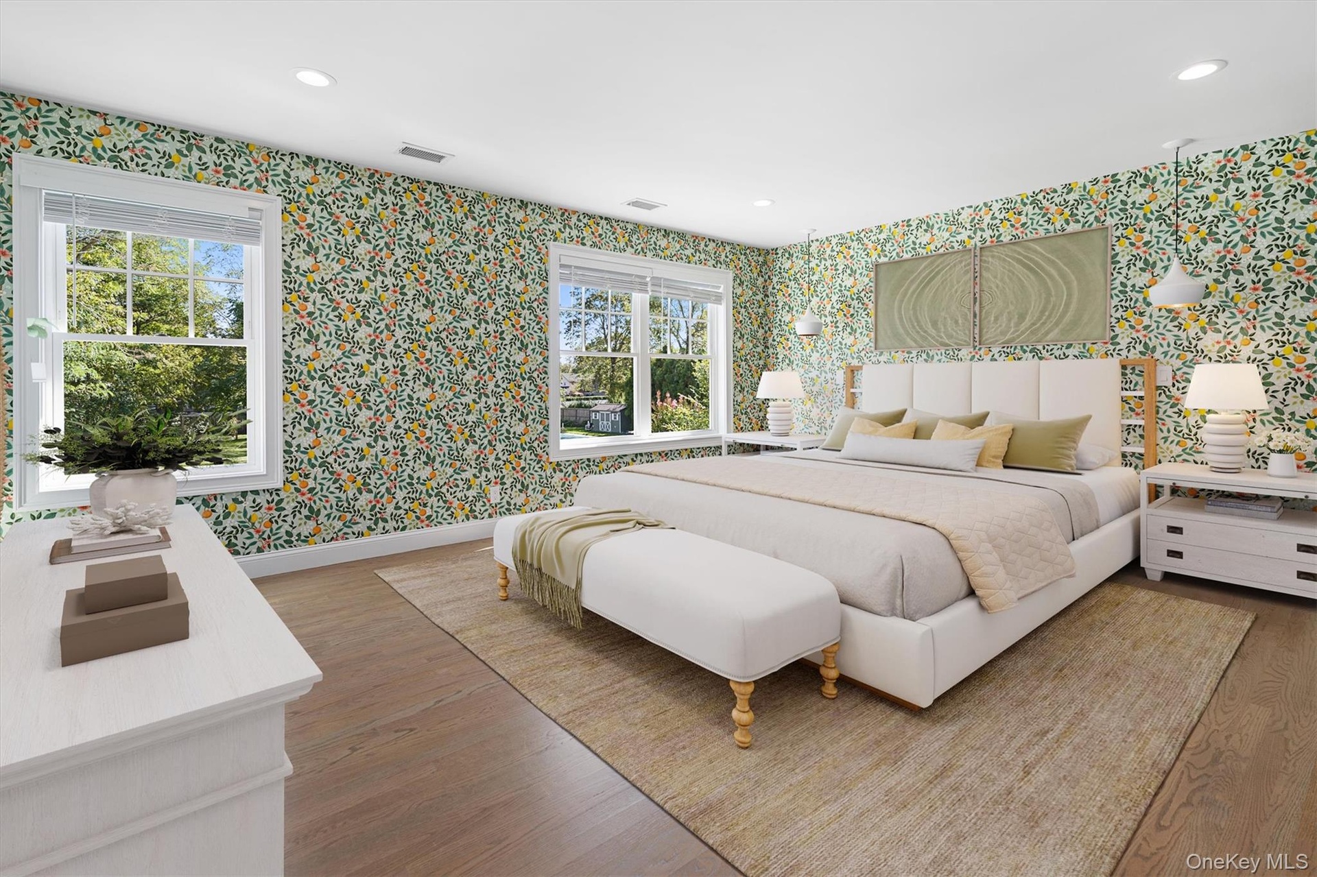 - Bedroom 1 featuring wallpapered walls, wood finished floors, and recessed lighting