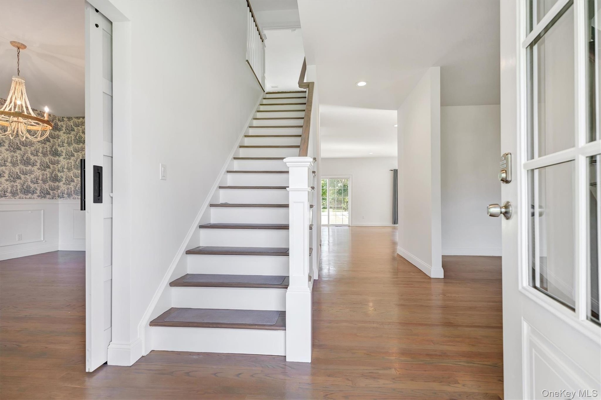 - Empty room featuring plenty of natural light, wood finished floors, a chandelier, stairs, and recessed lighting