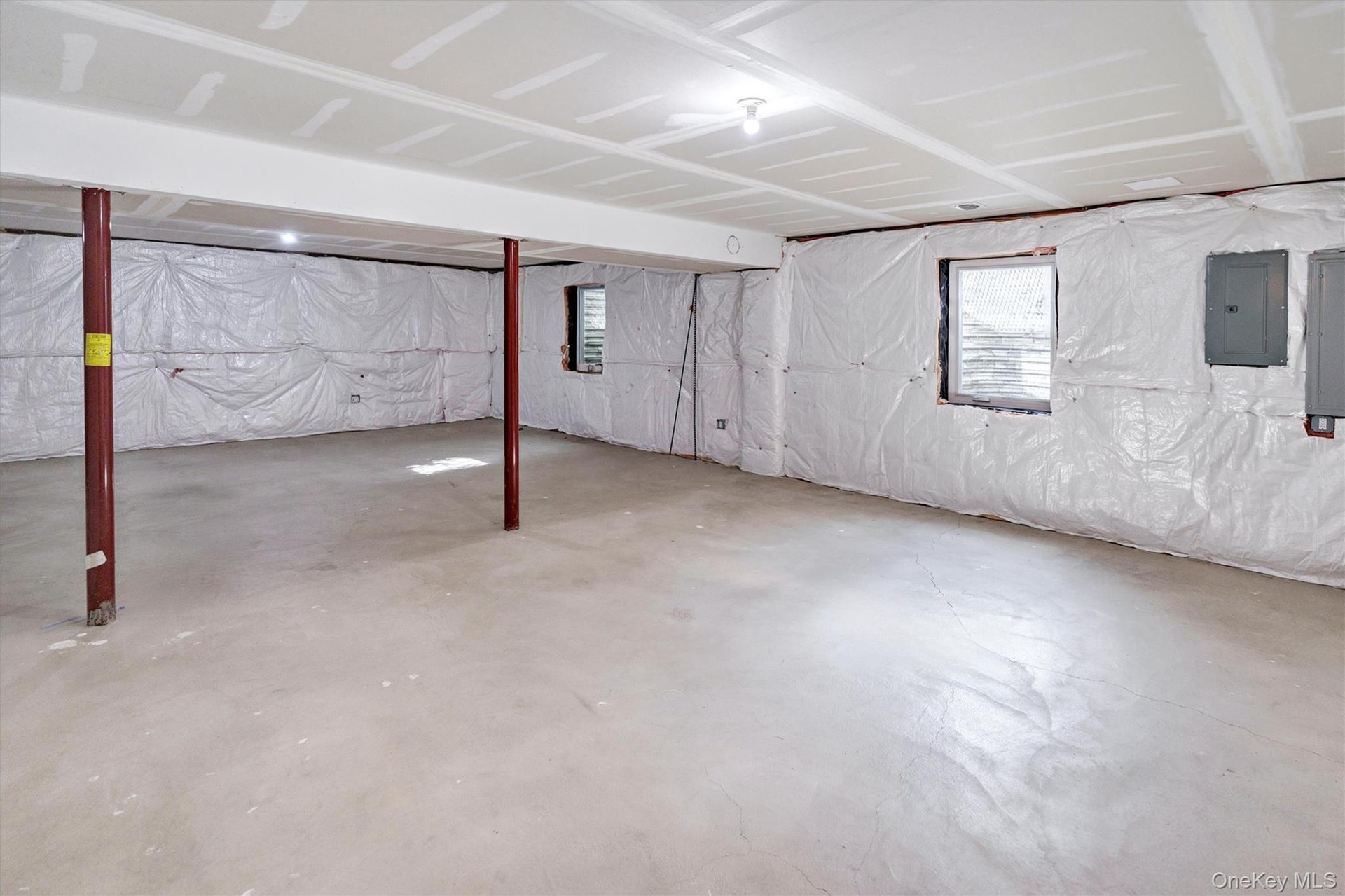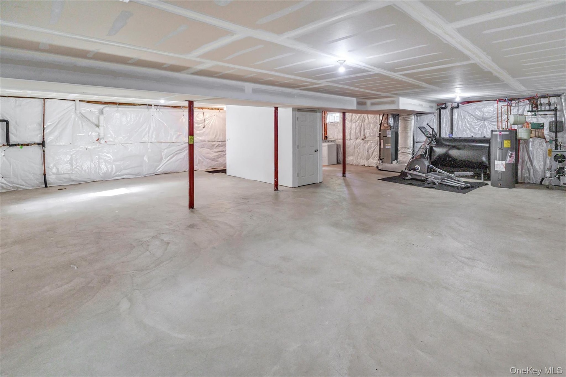 - Unfinished basement featuring electric water heater, a heating unit, heating unit, and washer / dryer
