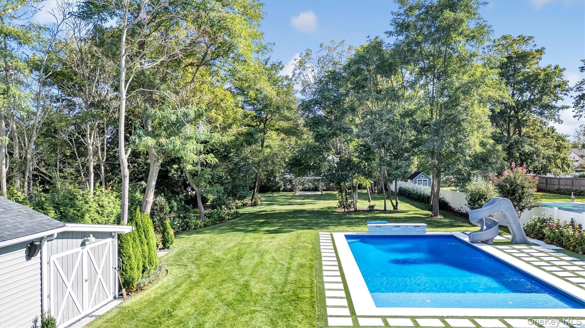 - View of swimming pool featuring a water slide, view of scattered trees, a patio area, and an outbuilding
