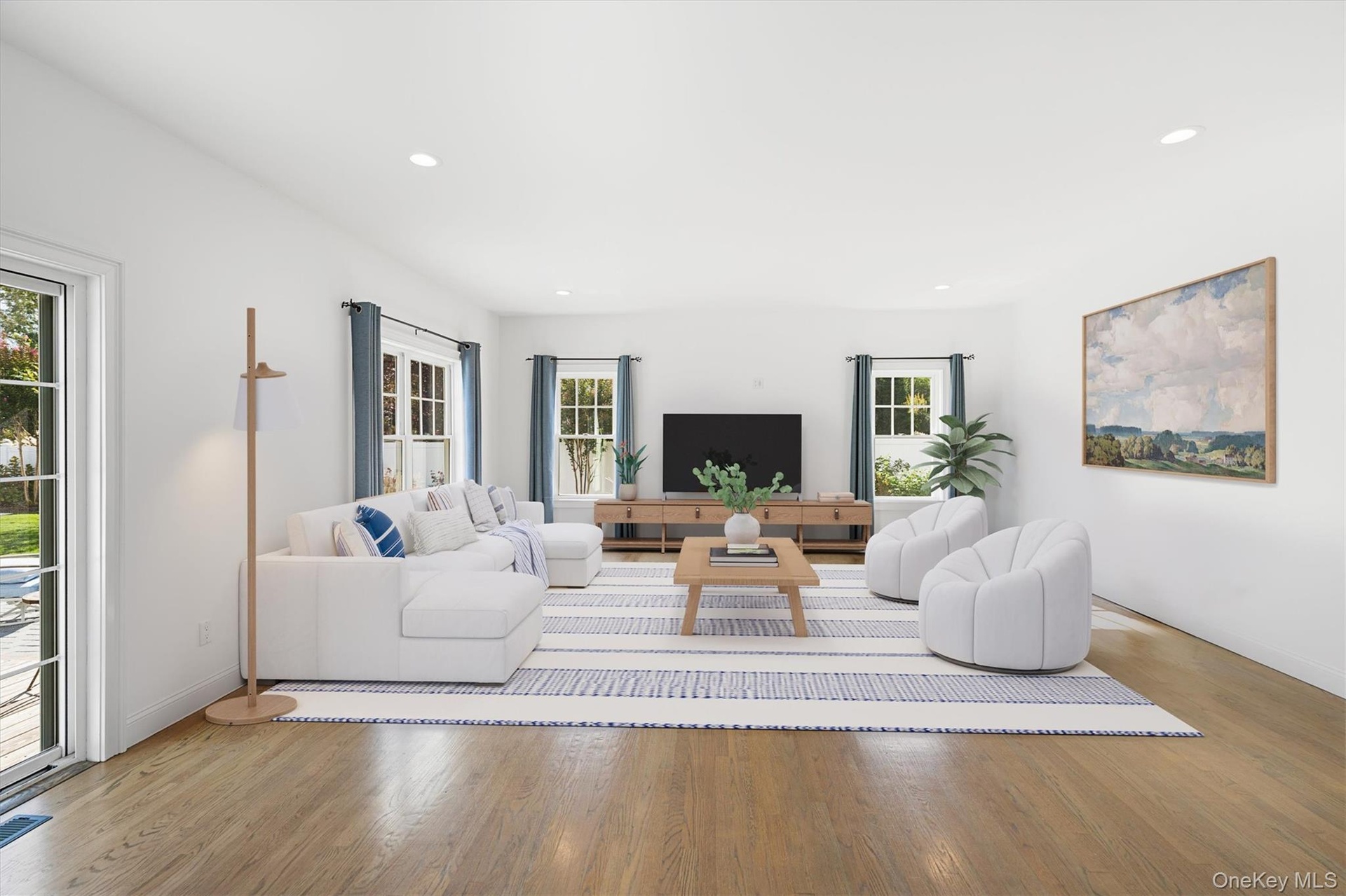 - Living area with dark wood-style flooring, recessed lighting, and healthy amount of natural light