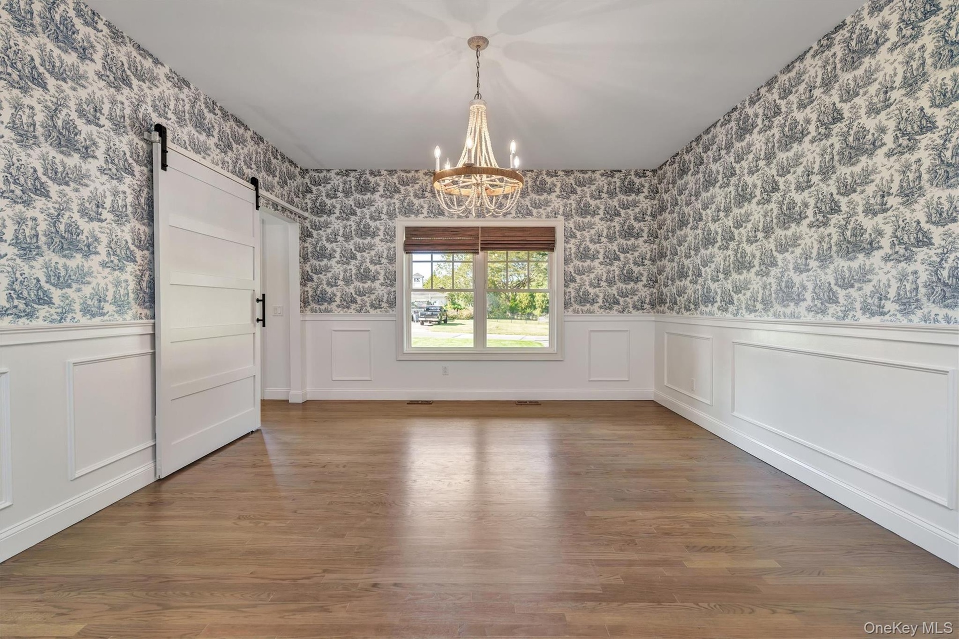 - Unfurnished dining area featuring wallpapered walls, a barn door, a chandelier, a wainscoted wall, and wood finished floors