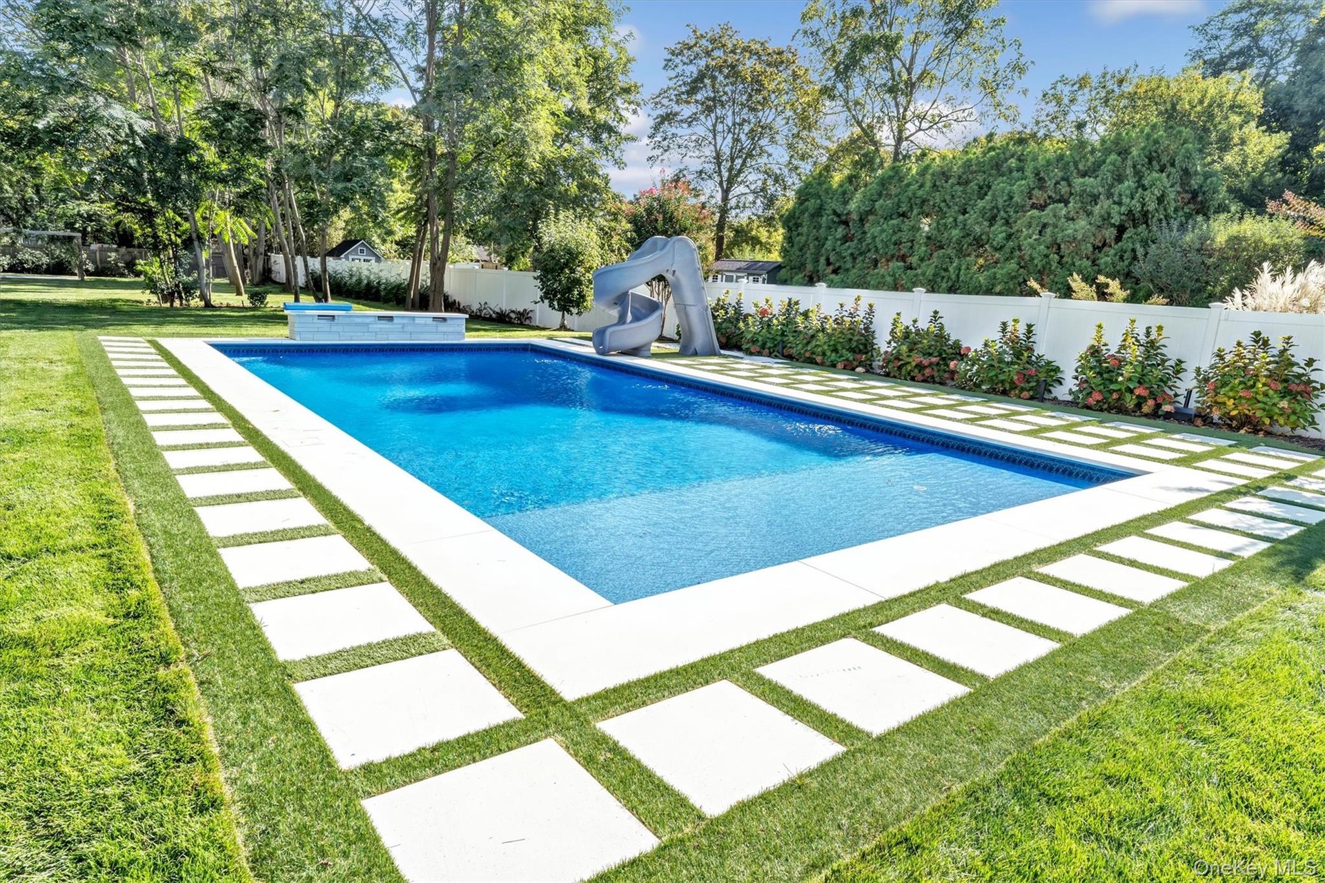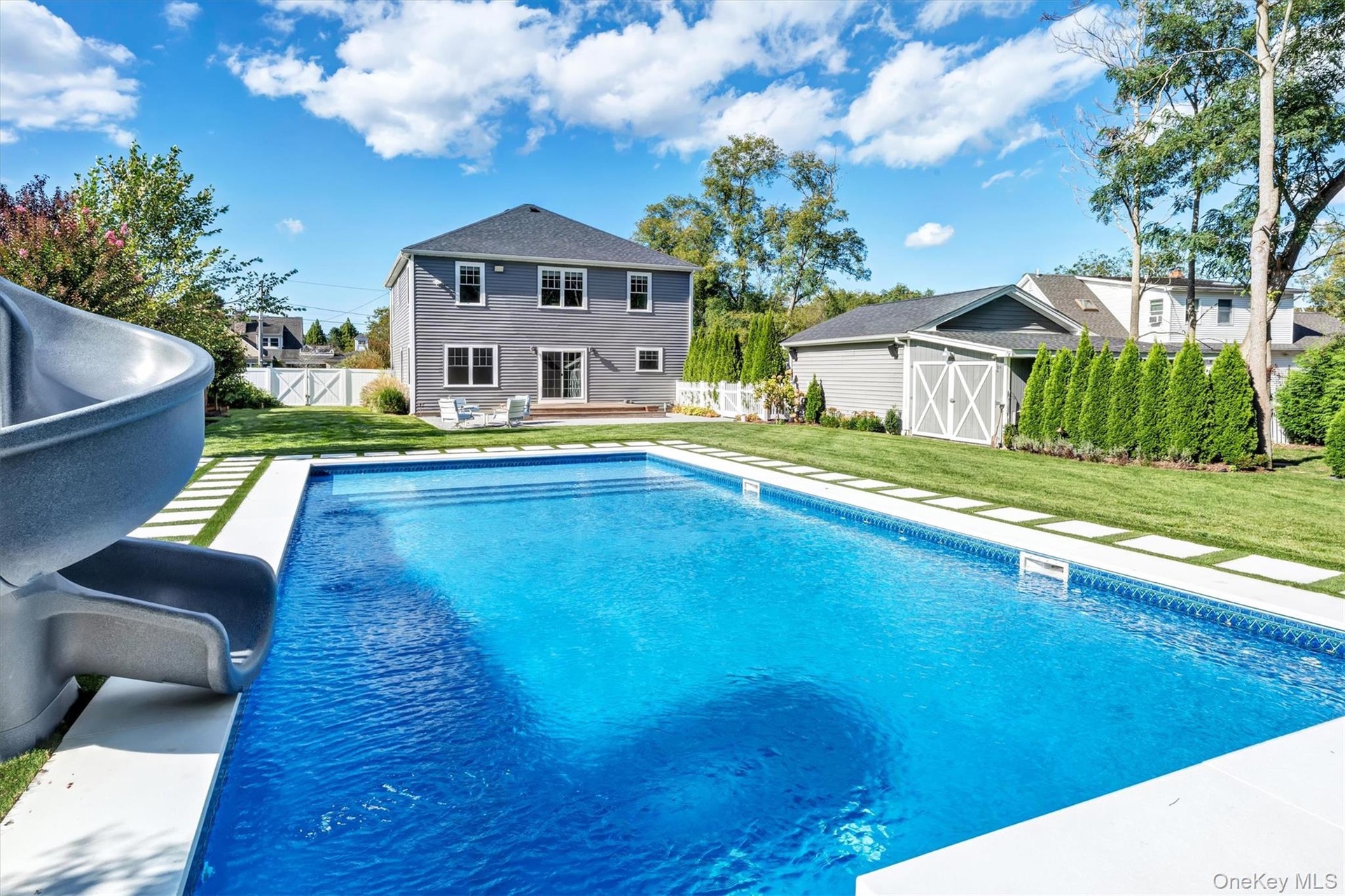 - View of swimming pool featuring a water slide, a fenced backyard, and a patio area