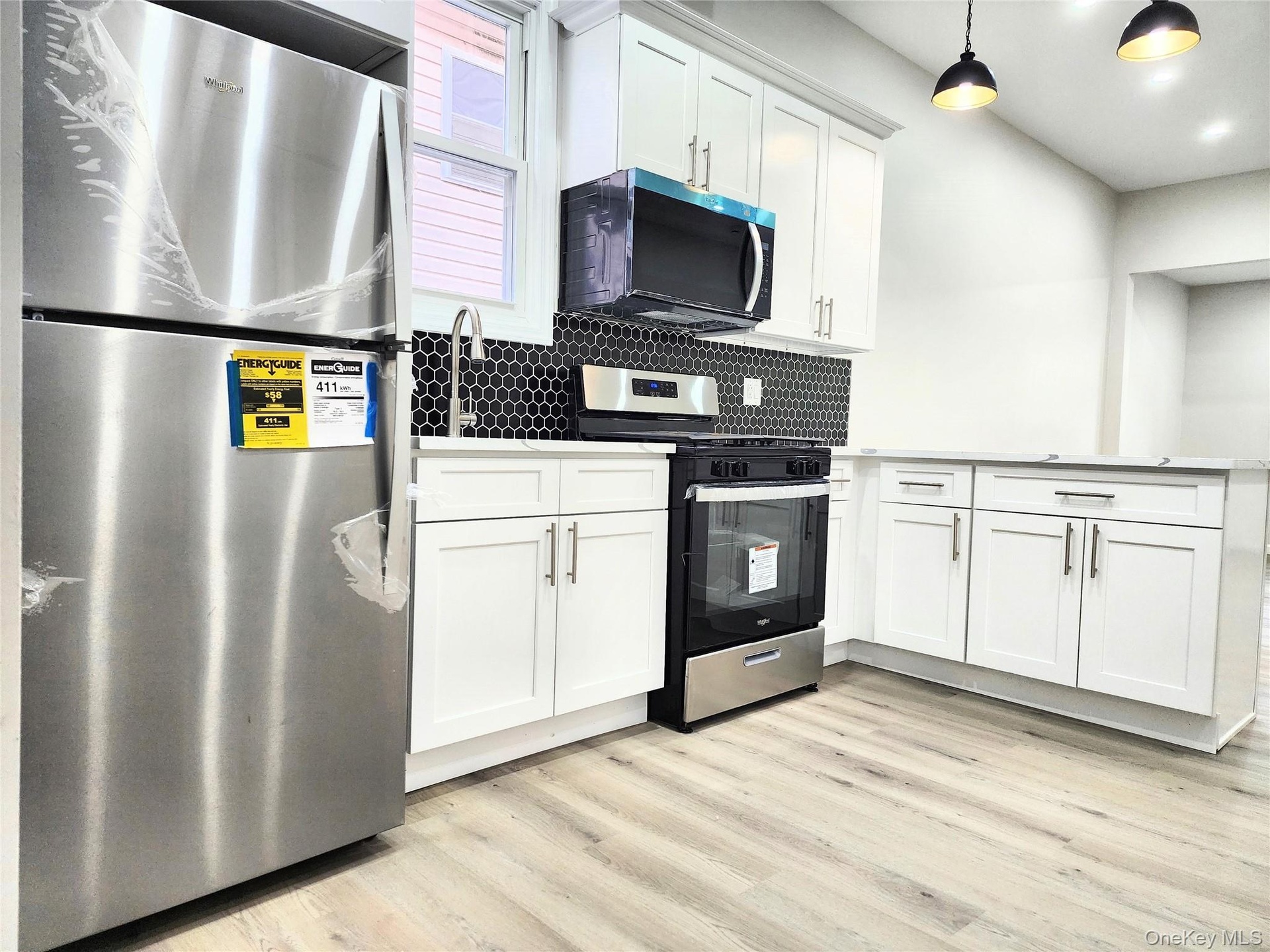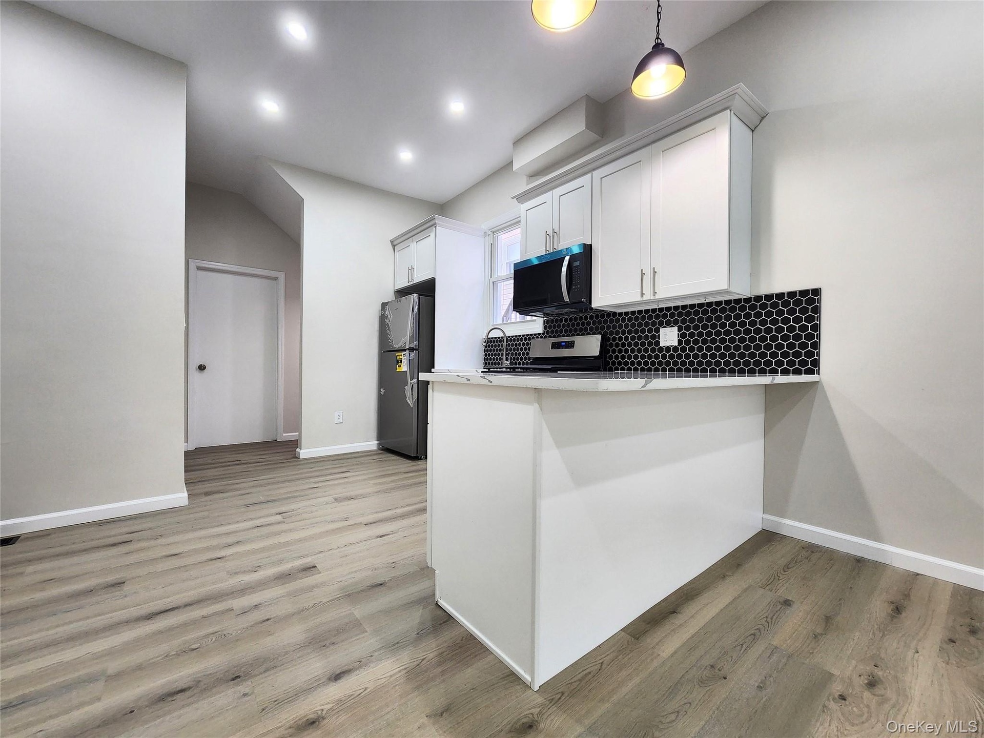 - Kitchen with stainless steel appliances, white cabinetry, tasteful backsplash, light wood-style flooring, and pendant lighting