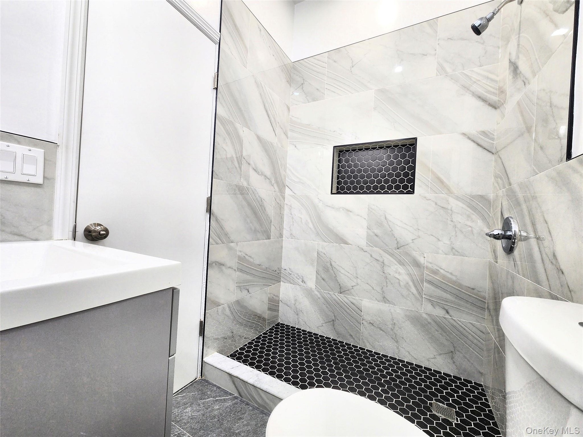 - Bathroom featuring vanity, a stall shower, and tile walls