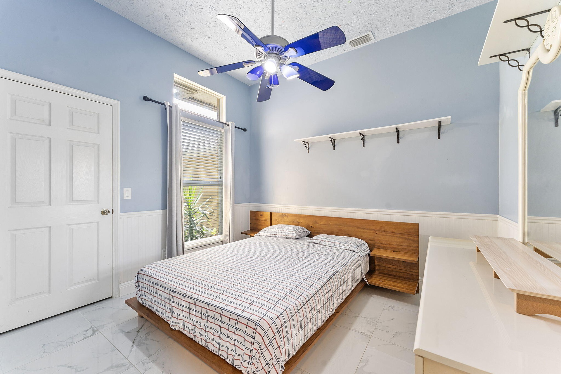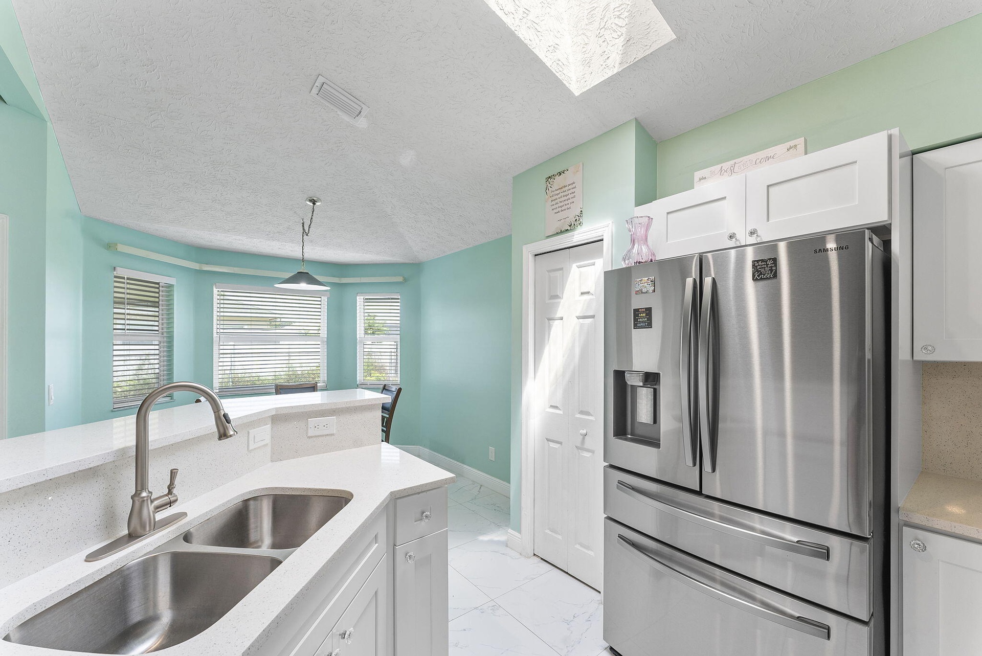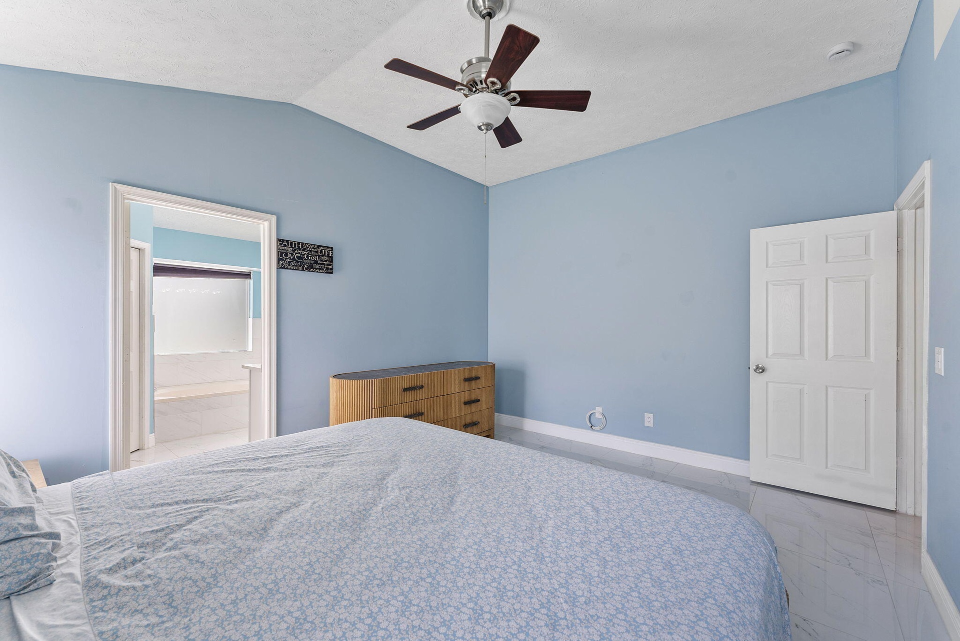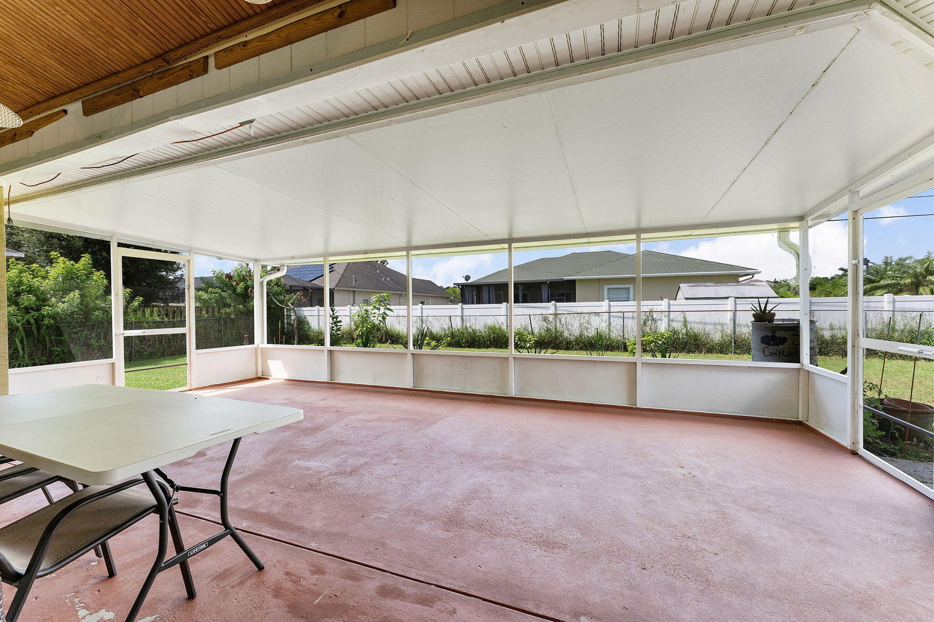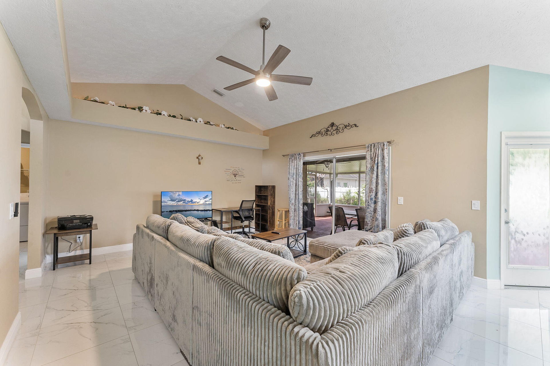 Completely remodeled 3-bedroom, 2-bath home in Port Saint Lucie with everything already done - new roof (2022), brand new water heater (2025), and upgraded electrical panel. This isn't just a cosmetic flip - it's been renovated from the studs up with marble-look tile throughout, completely updated kitchen with white cabinets, quartz counters, and stainless appliances opening to the vaulted ceiling living area.Master suite features dual vanity bath with separate shower and tub, while two additional bedrooms share a second fully renovated bathroom. The real winner here is the huge screened lanai overlooking a spacious backyard with room for a pool.