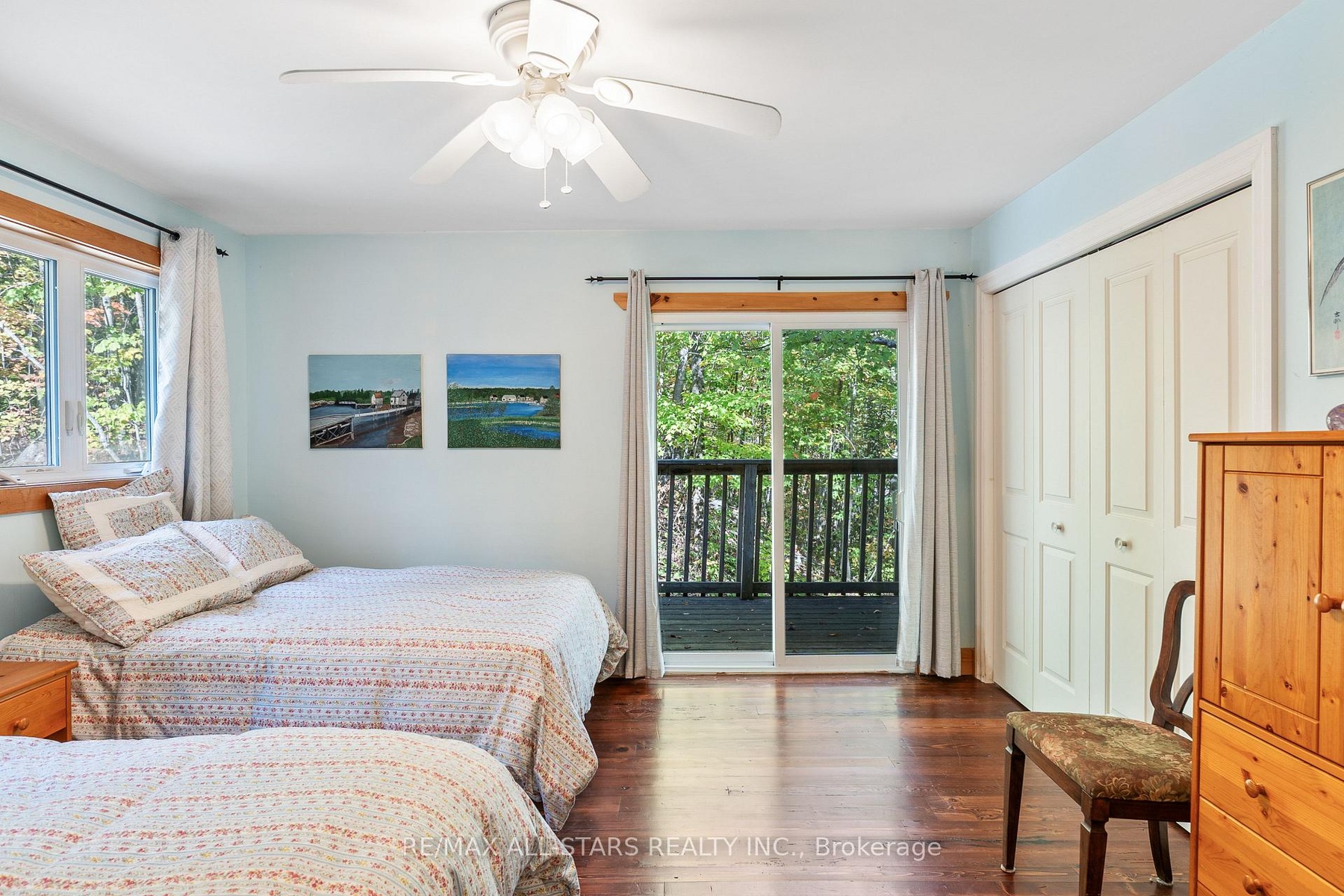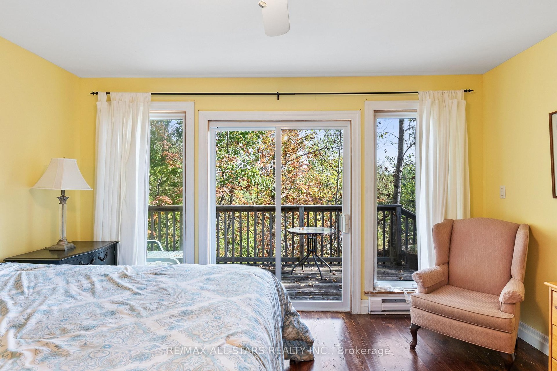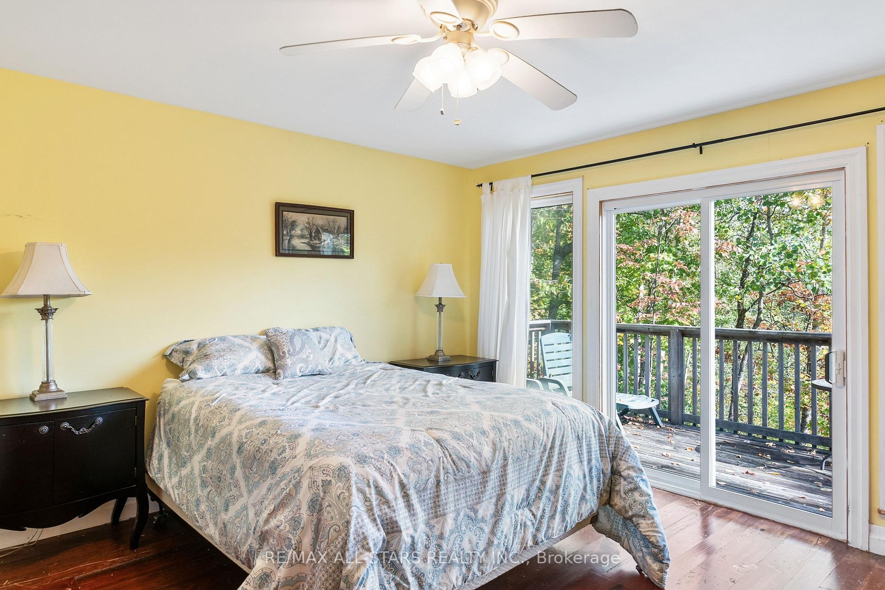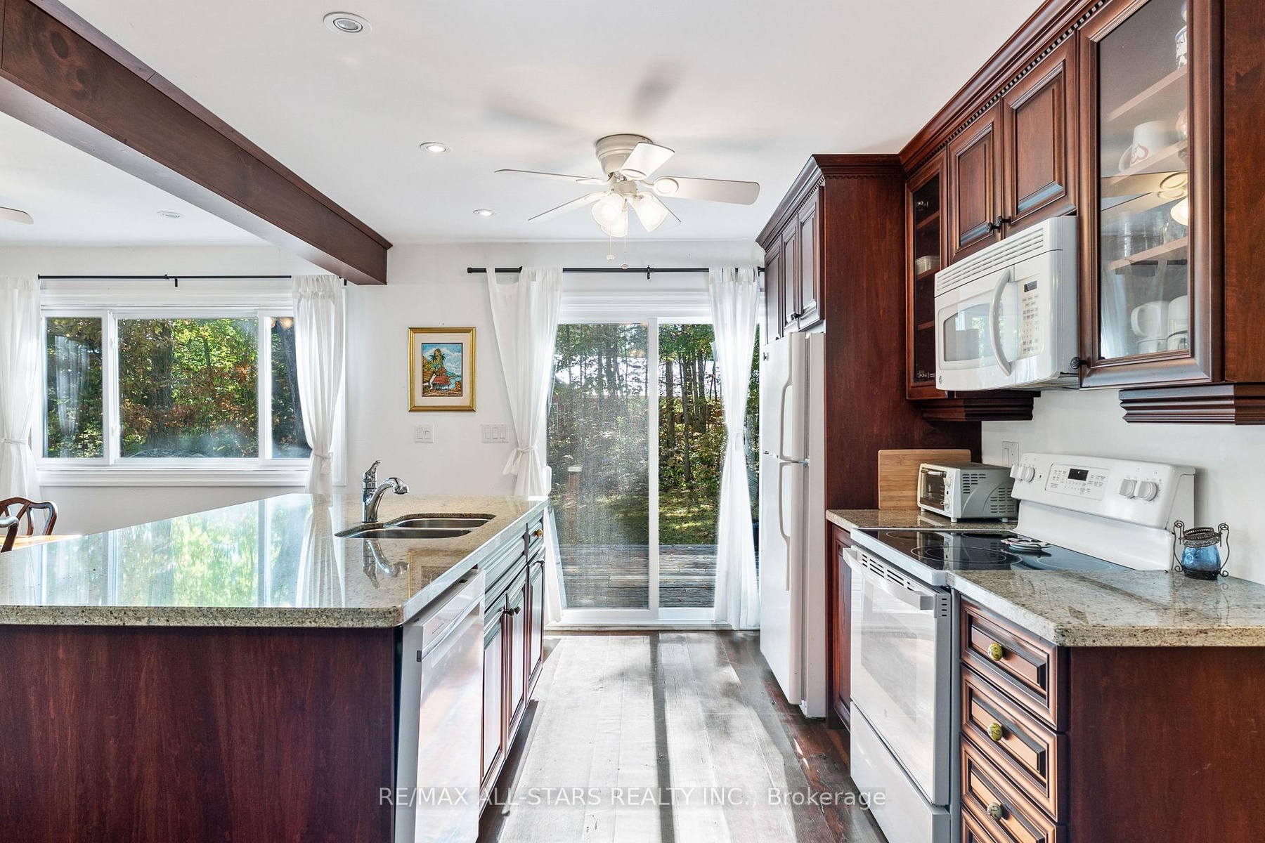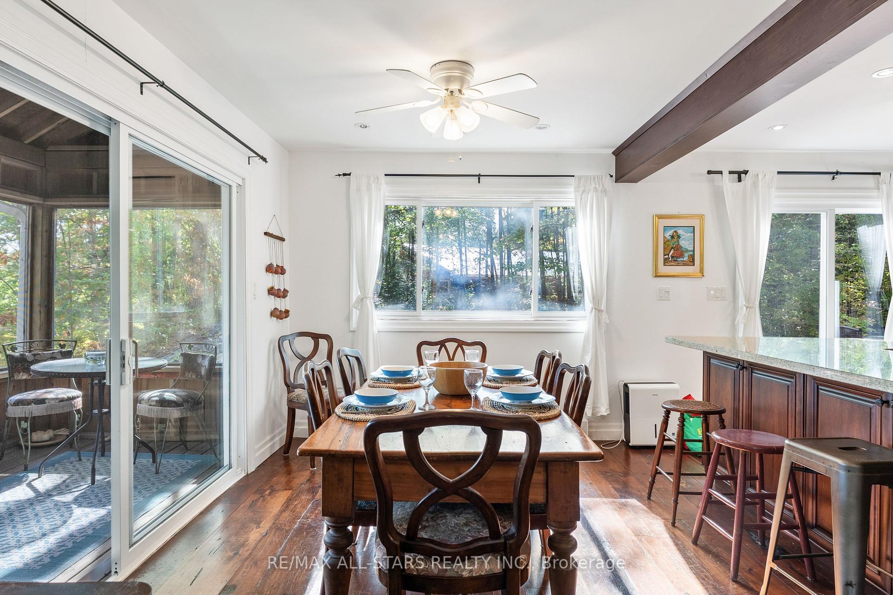 This 3-bedroom, 2-bath bungalow is full of cottage-country charm and sits on a beautifully treed 1.26-acre lot offering exceptional privacy and a true escape to nature. Inside, the open-concept main living area is flooded with natural light from large windows and features a custom kitchen with granite countertops and a center island. The combined dining and living room is warm and inviting, complete with a cozy woodstove and walkout to a bright 3-season sunroom-perfect for relaxing while enjoying views of the lake. The spacious primary bedroom offers a private 3-piece en-suite and direct access to the lakeside deck. Two additional bedrooms and an oversized 4-piece main bath complete the main floor layout. Step outside to enjoy extensive decking, perfect for outdoor entertaining or quiet relaxation. Just across a quiet country road, you'll find your deeded access to the serene Tamarack Lake. The waterfront is level and easy to access, with a brand new dock ready for your enjoyment. Tamarack Lake is a quiet, electric-motor-only lake, ideal for peaceful paddling and known for great bass fishing. Whether you're looking for a year-round home or a weekend getaway, this property offers the perfect blend of comfort, charm and nature.