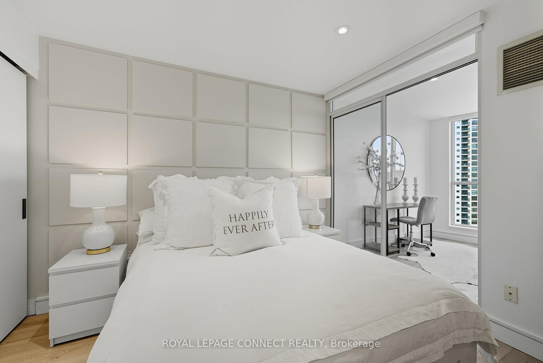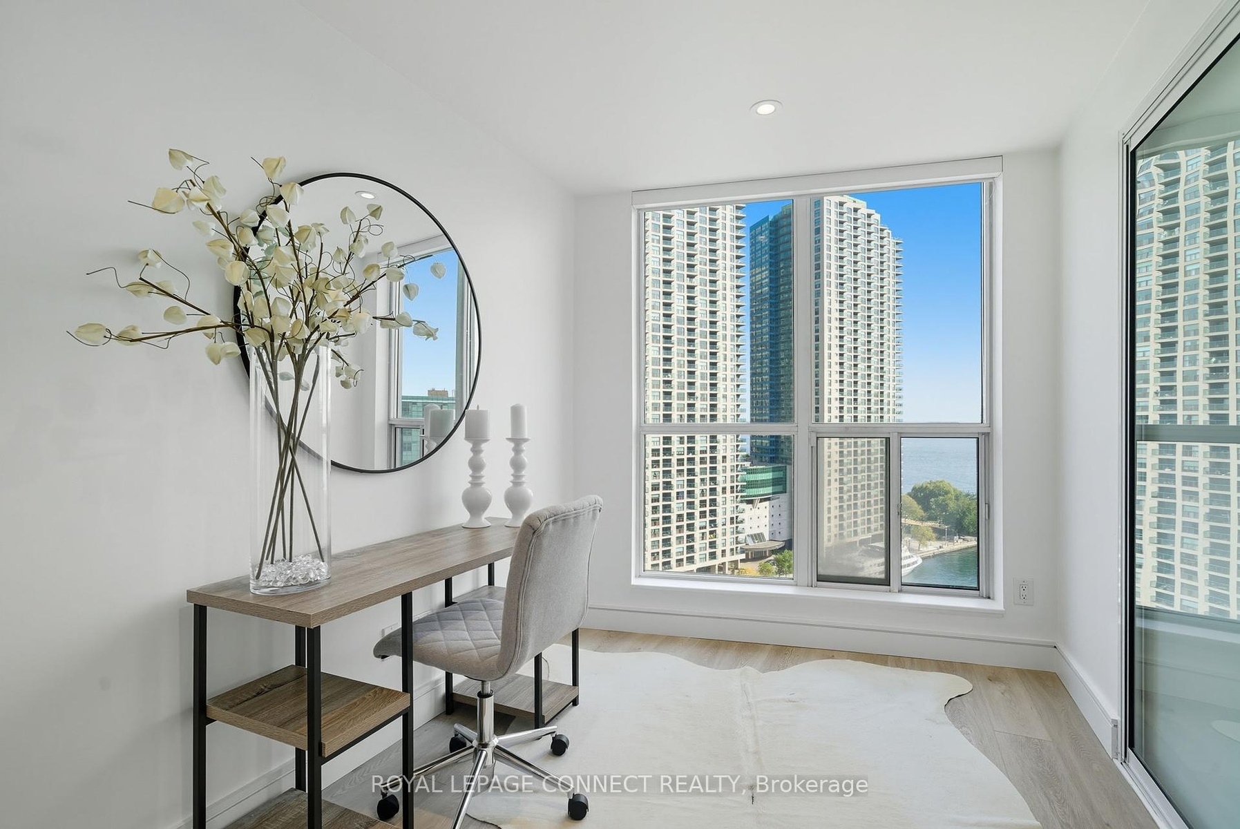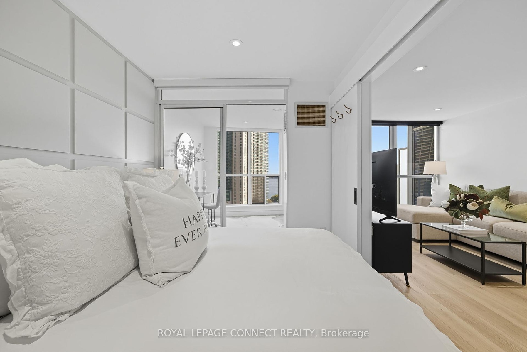 Experience true luxury waterfront living with unobstructed south facing views of Lake Ontario and the marina, a breathtaking backdrop that floods this condo with natural light and tranquility. Inside, the fully renovated residence showcases a custom designed kitchen with quartz waterfall countertops, an oversized island ideal for entertaining, designer fixtures, and premium finishes throughout. Custom built in cabinetry maximizes storage, while smooth ceilings, accent walls, and pot lights add modern sophistication. Spa inspired bathrooms are finished with elegant details. Perfectly located just steps from the PATH, GO Train, and TTC, and within walking distance of the Financial and Entertainment Districts, this home combines urban convenience with the beauty of lakefront living. A rare opportunity to own a refined, upgraded condo in one of downtown Toronto's most desirable locations, where every day begins and ends with iconic waterfront views.