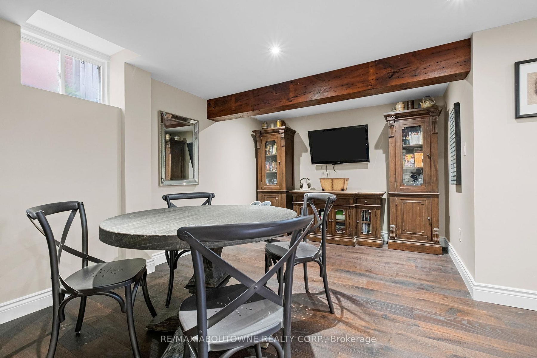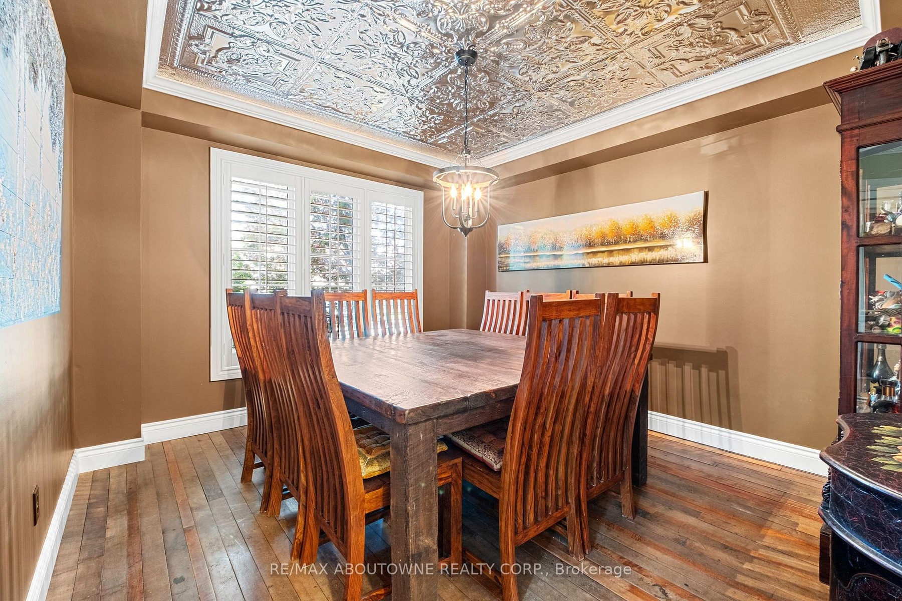 This beautifully maintained Original Owner home in Milton's sought-after Beaty neighbourhood offers exceptional quality, warmth, and care throughout. Southwest-facing and filled with natural light, this 3-bedroom, 4-bathroom home features a welcoming layout beginning with a separate Dining Room enhanced by a Tin Feature Ceiling. Both the Living Room and Dining Room offer rich One-of-a-kind Antique Hardwood Flooring, while the Living Room offers a stylish matching Tin Feature Wall. The Custom Thomasville Designer Kitchen showcases Quartz Countertops, a 36 Franke Fireclay Apron Double Sink, a Built-In Oven and Gas Cooktop, Custom Stained Glass Cabinets, a Paneled Dishwasher, Under-mount and in-cabinet Lighting, and Custom Cabinet Hardware. The Upper Level features three generously sized Bedrooms, each with Custom Closet Organizers, and a beautifully appointed Primary Ensuite. The Finished Basement includes a large Rec Room with Engineered Hardwood Flooring, Upgraded Windows, Pot Lights, a Wood Beam Ceiling Accent, and a Stone Fireplace Feature, plus a separate Laundry Room and plentiful Storage. Step outside to a Large, Rare 65 foot Deep Private Backyard with Mature Trees, a spacious Deck, a Stone Patio area, and a Cedar Pergola perfect for outdoor enjoyment. Additional highlights include Parking for 3 cars in the extended driveway plus 1 in the garage, New Central AC (2025), California Wooden Shutters throughout main floor, crown molding and high-end baseboard & trim, thoughtfully designed Closet Organizers throughout All of the home. This is a truly special property that has been lovingly cared for and upgraded with immense detail for long-term enjoyment in mind.