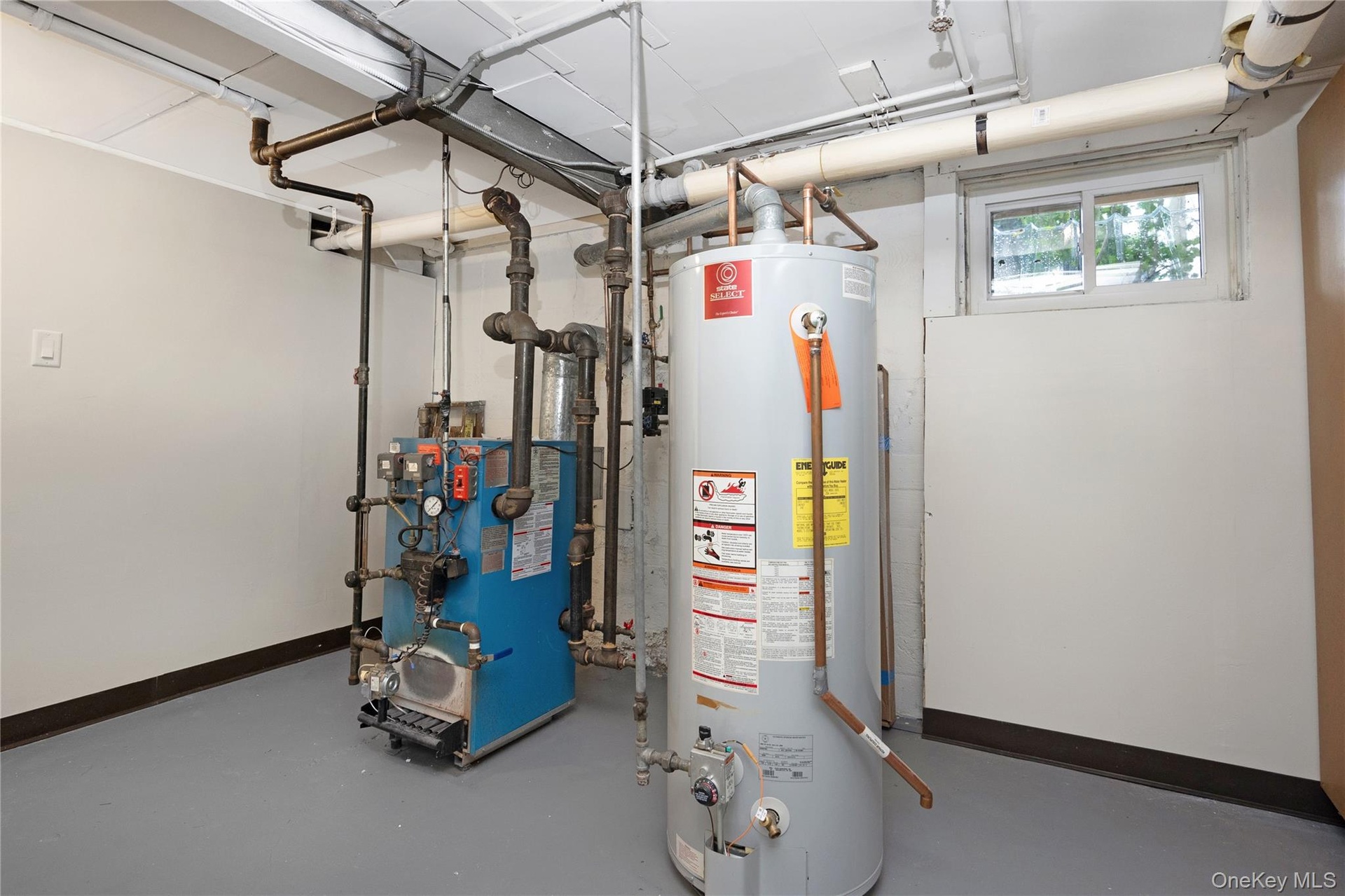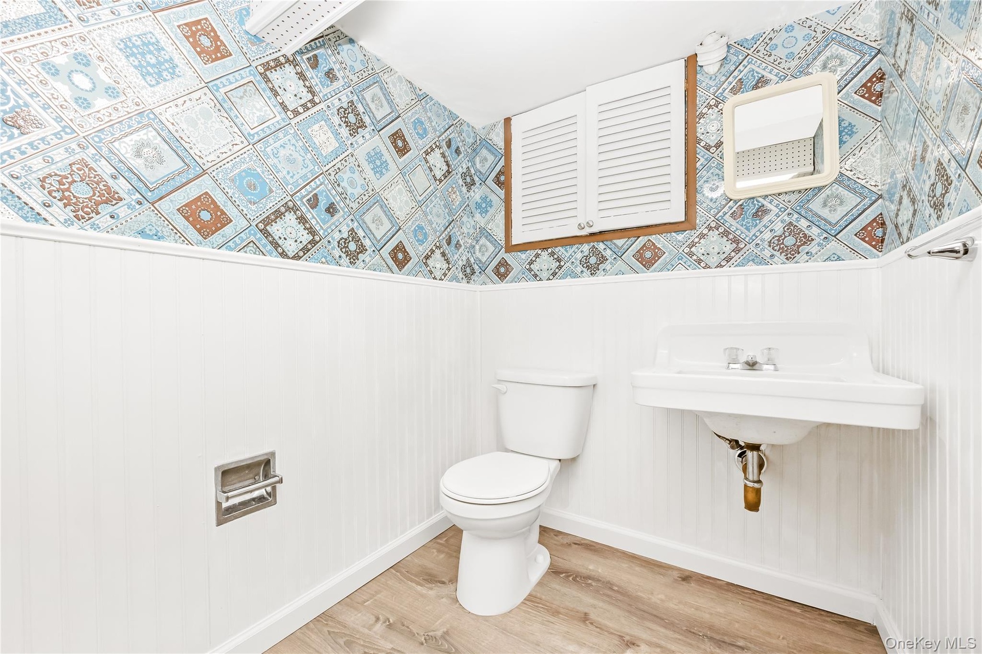 The expansive, full, open basement provides ample storage and features new Lifeproof vinyl wood flooring along with a half bath which features trendy geometric wallpaper with white half wall wainscot. Additional amenities include a utility/workroom with washer, dryer, sink, gas boiler, free-standing gas hot water heater, and a hanging wardrobe cabinet.