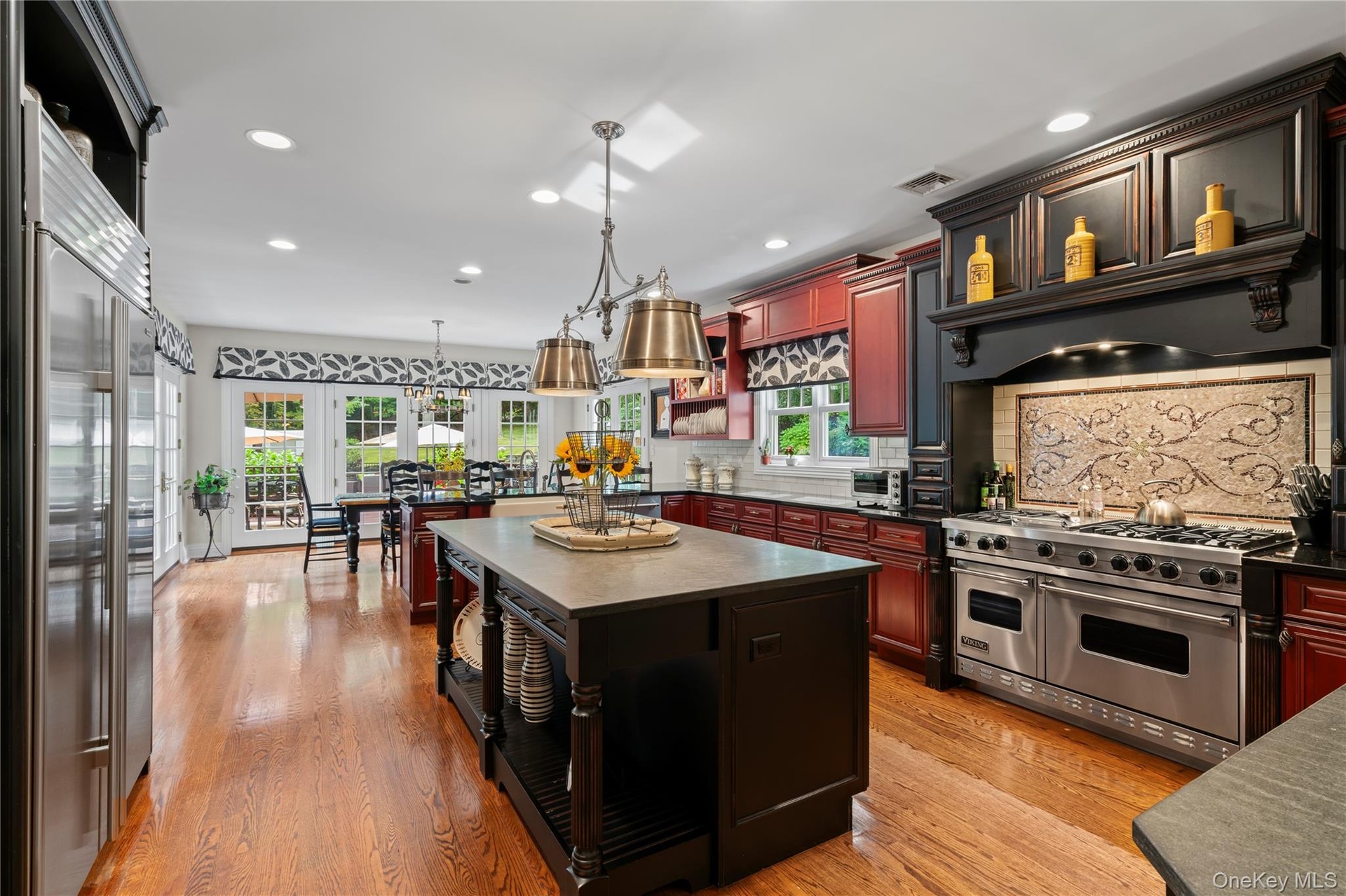 The chef’s kitchen is a masterpiece, with stainless steel appliances, a six-burner Viking grill cooktop range with double ovens below, and a commercial-grade hood. Granite countertops, a sandstone island, large walk-in pantry, and extensive two-tone cabinetry elevate the space. Three sets of French doors lead to a large mahogany deck, perfect for outdoor dining and relaxation. The great room off the kitchen is equally impressive, featuring a wood-burning fireplace with access to the deck through French doors, creating a seamless indoor-outdoor flow.