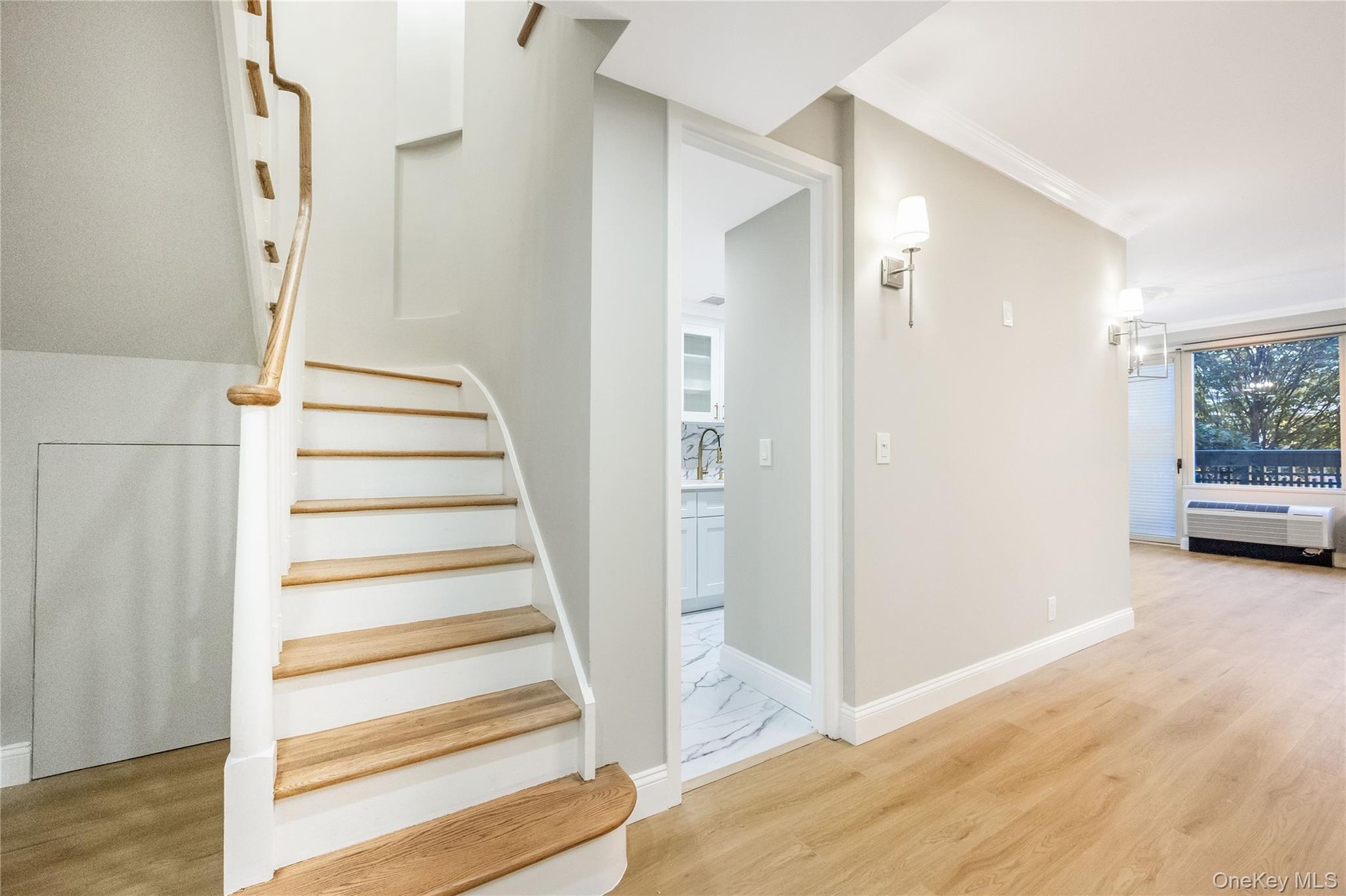 - Staircase with wood finished floors, a wall mounted AC, and crown molding