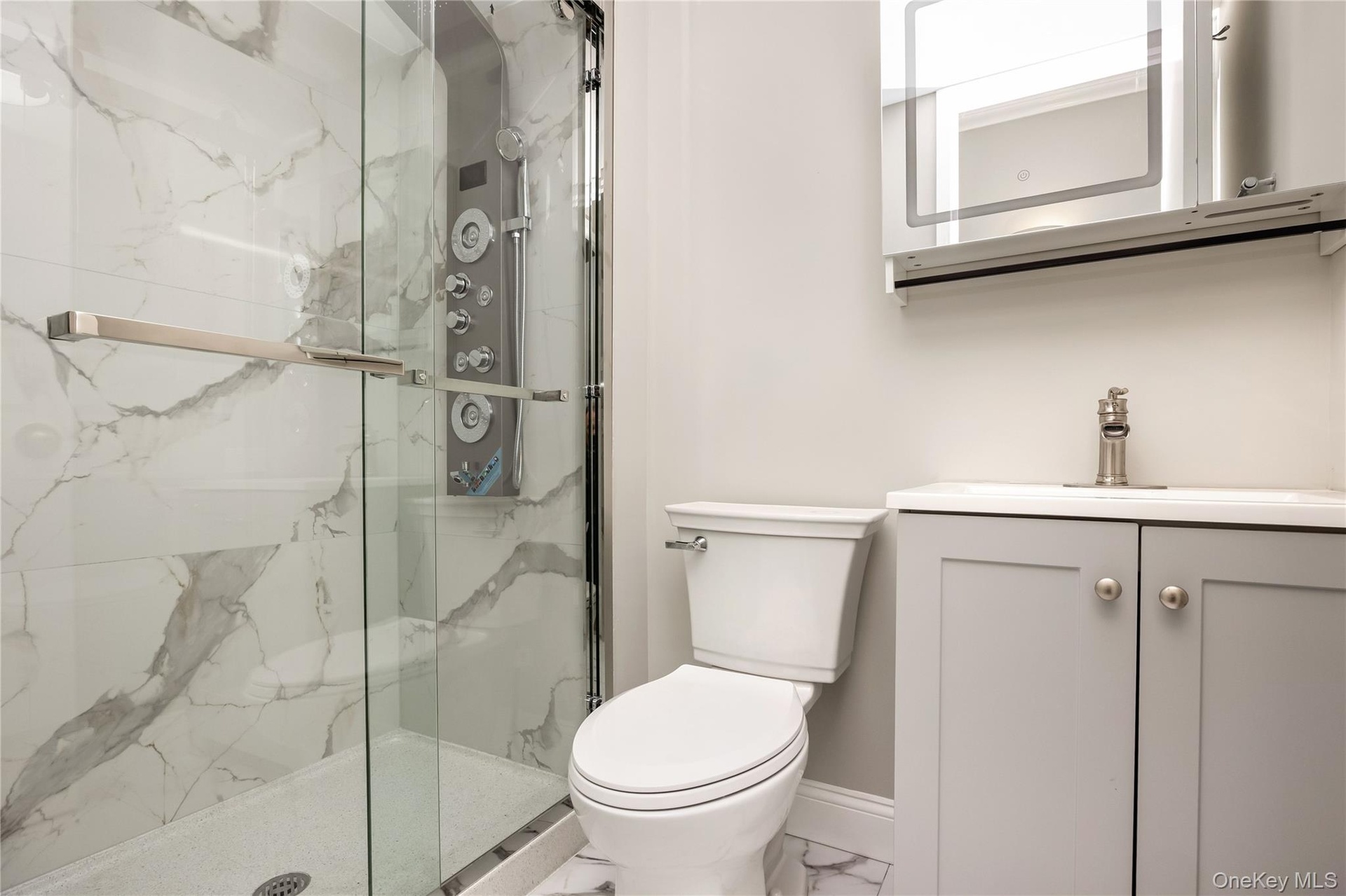 - Full bathroom featuring a marble finish shower, vanity, and marble finish floors