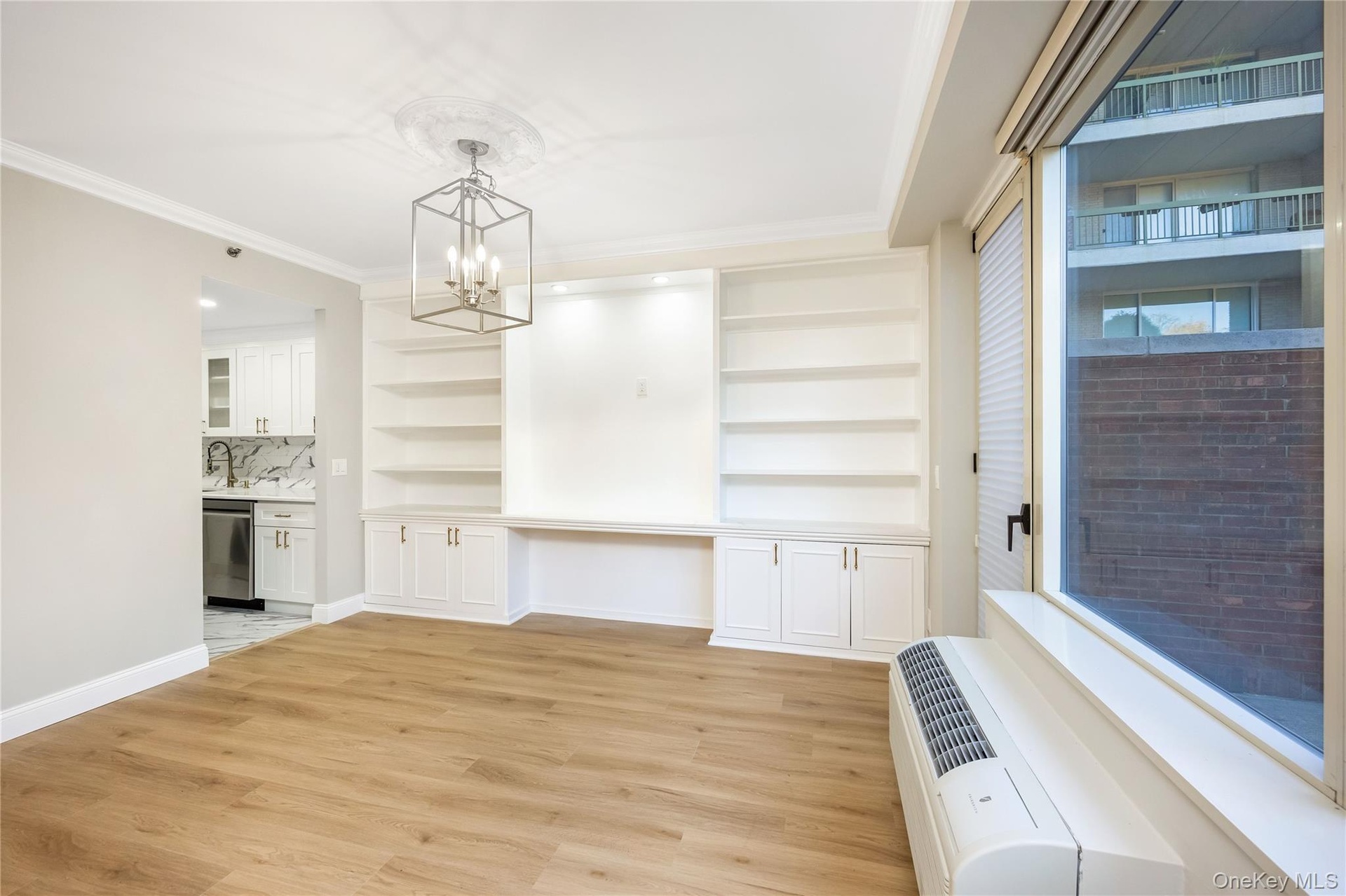 - Unfurnished dining area featuring light wood-style flooring, ornamental molding, a wall mounted AC, a chandelier, and built in shelves