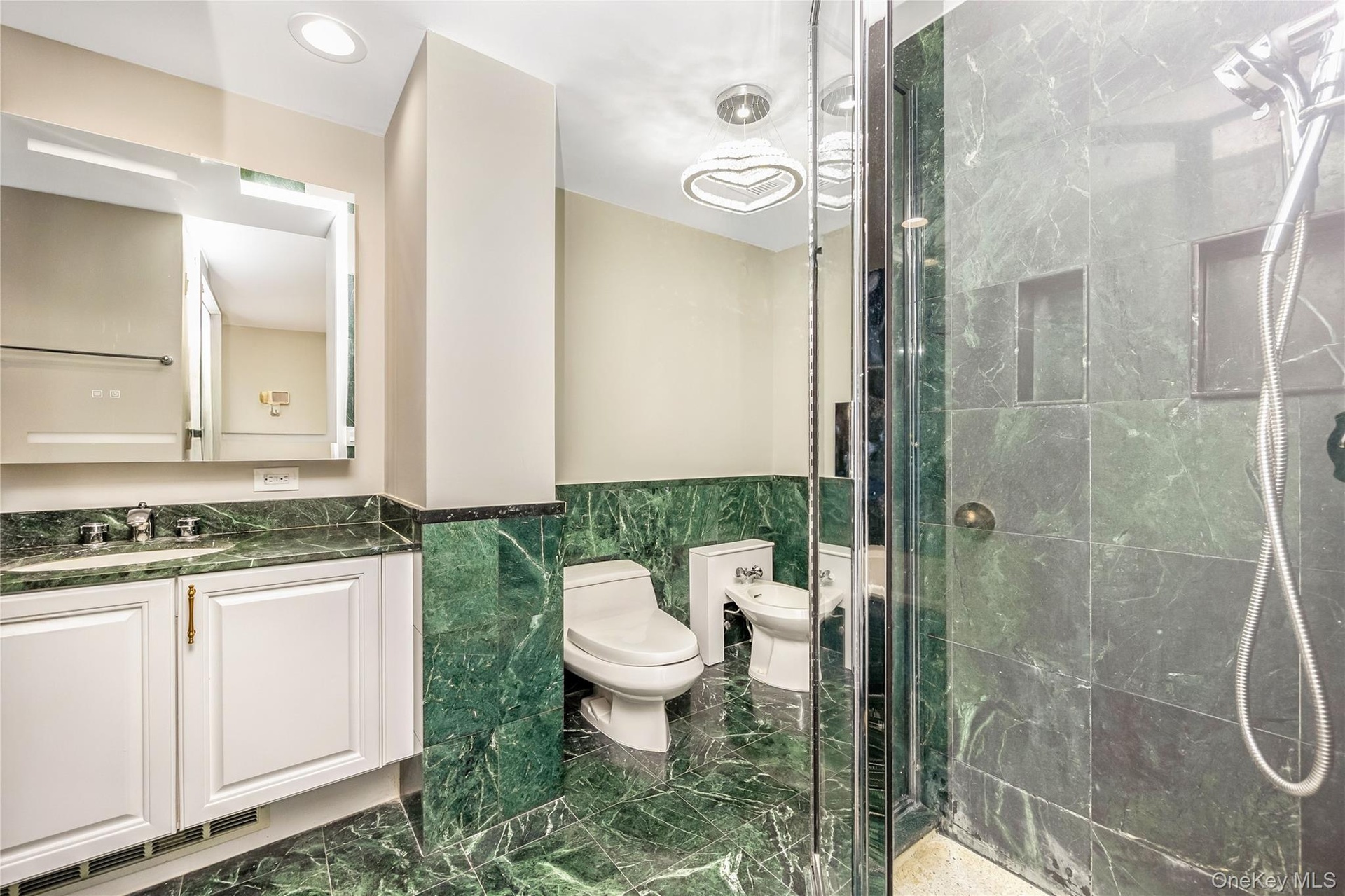 - Bathroom with vanity, a shower stall, tile walls, a bidet, and a wainscoted wall