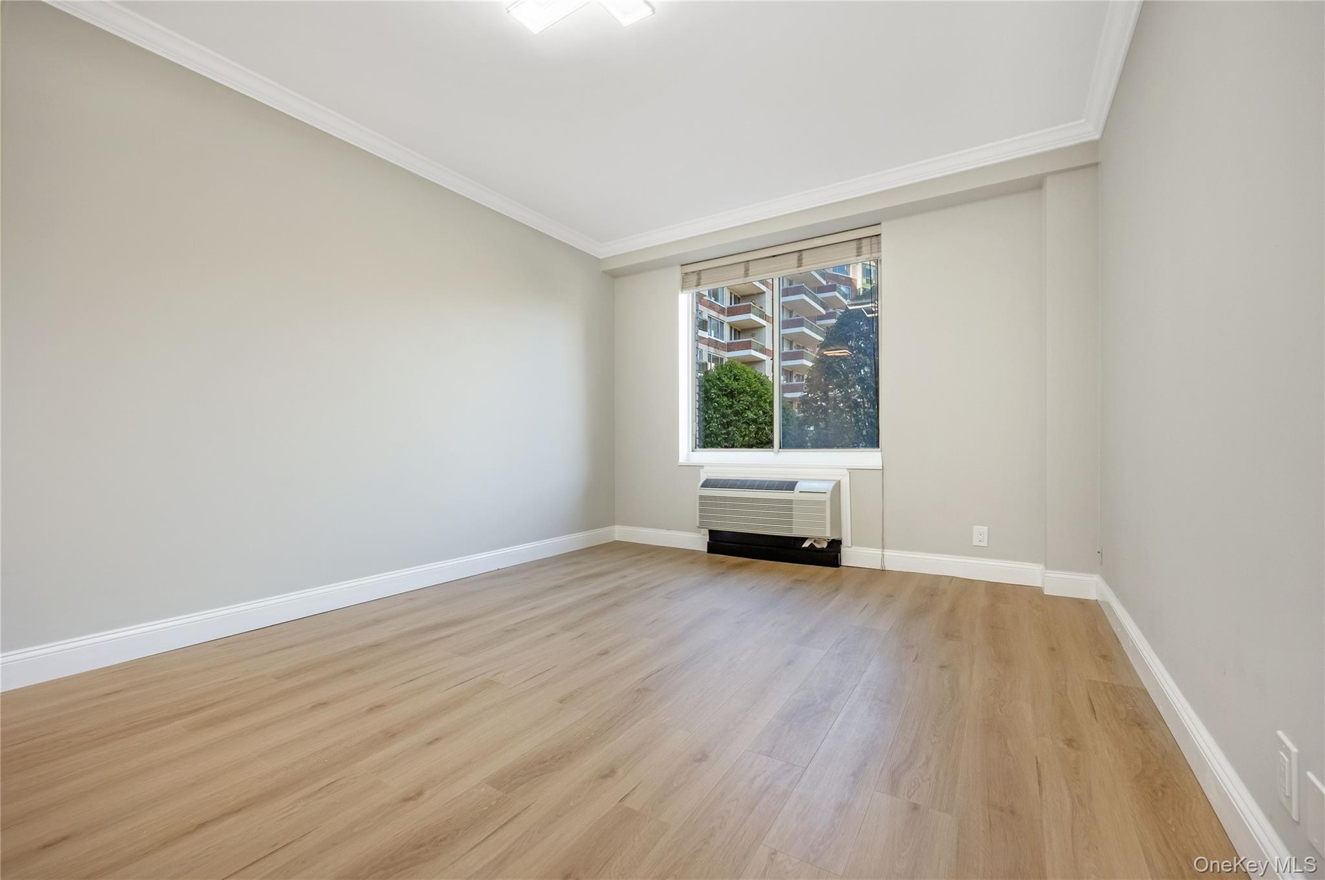 - Unfurnished room with light wood-type flooring, ornamental molding, and a wall unit AC