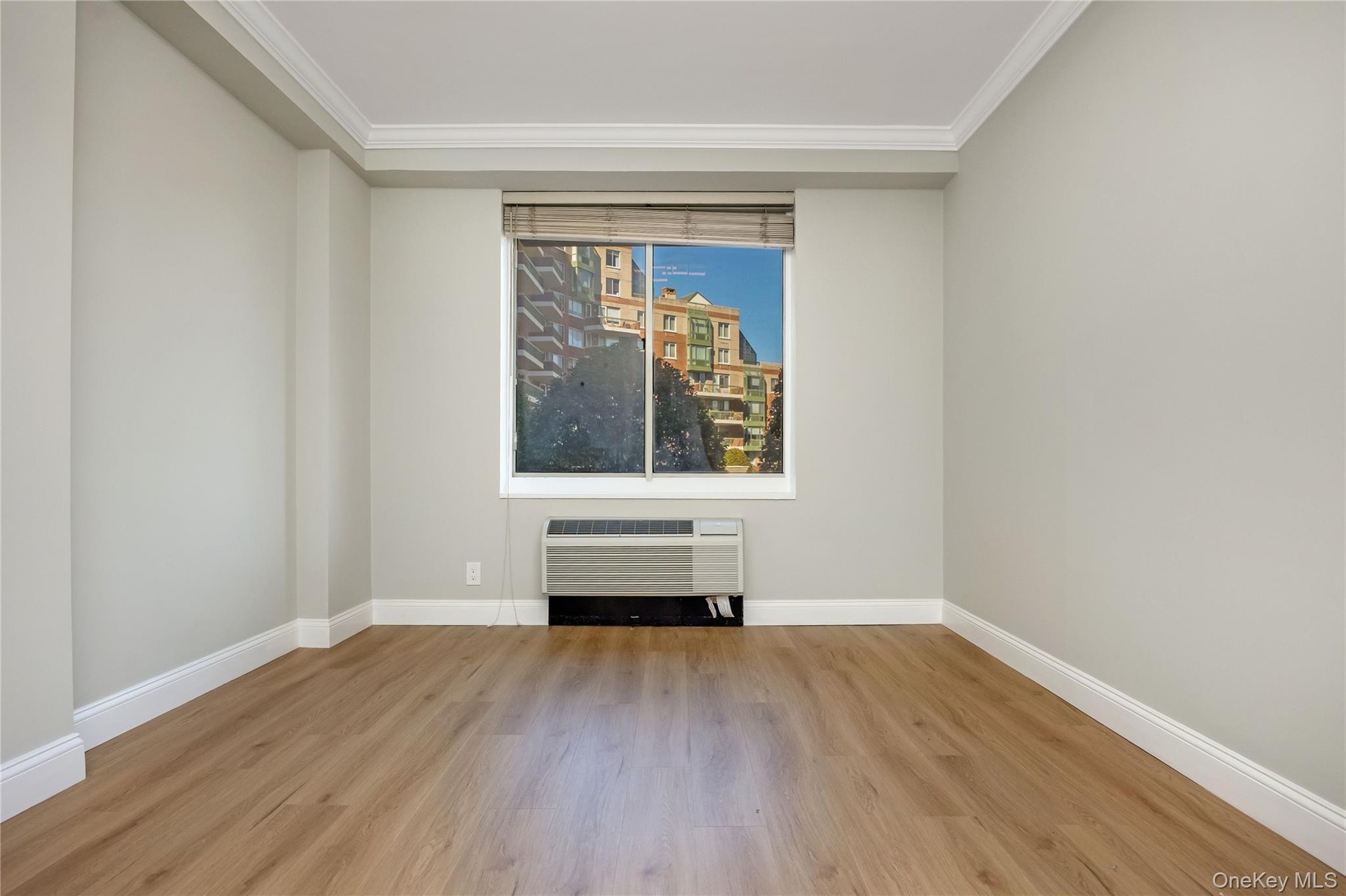 - Unfurnished room with wood finished floors, crown molding, and a wall mounted air conditioner