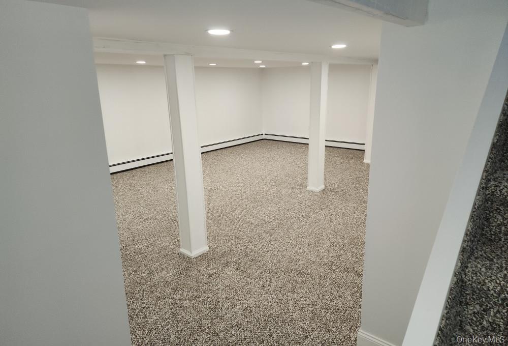 - Below grade area featuring a baseboard heating unit and recessed lighting