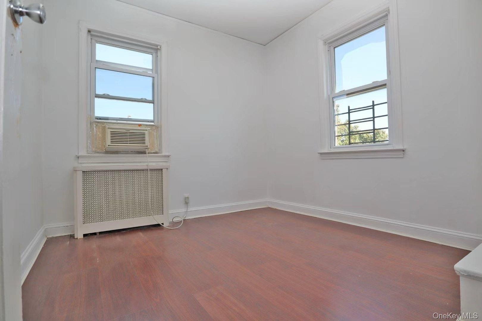 - Empty room featuring radiator heating unit, wood finished floors, and cooling unit