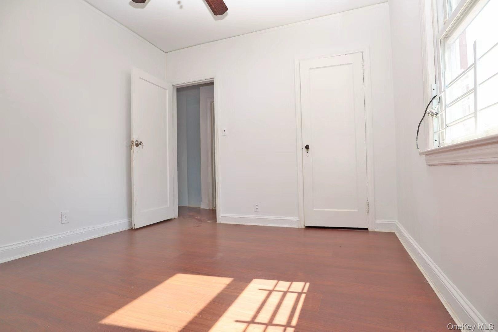 - Unfurnished bedroom with wood finished floors and a ceiling fan