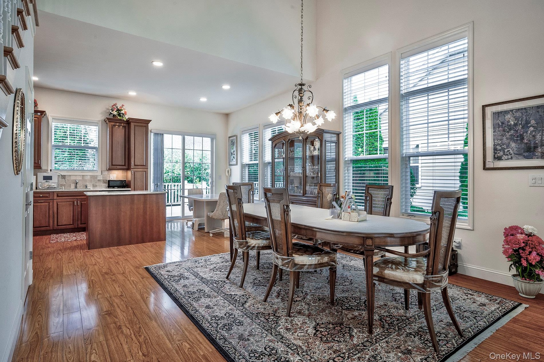 - Dining room with recessed lighting, a chandelier, dark wood-style floors, and a high ceiling